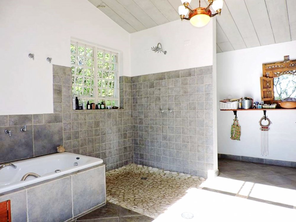 Banheiro da máster com hidro, box de pedras e pia em mármore.