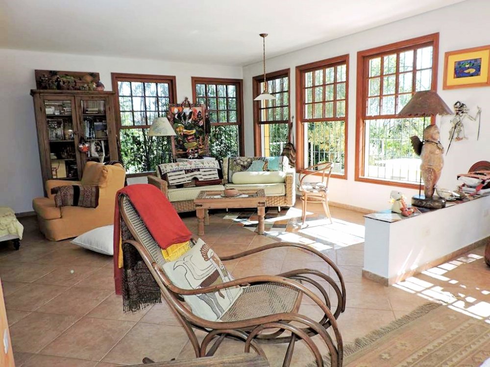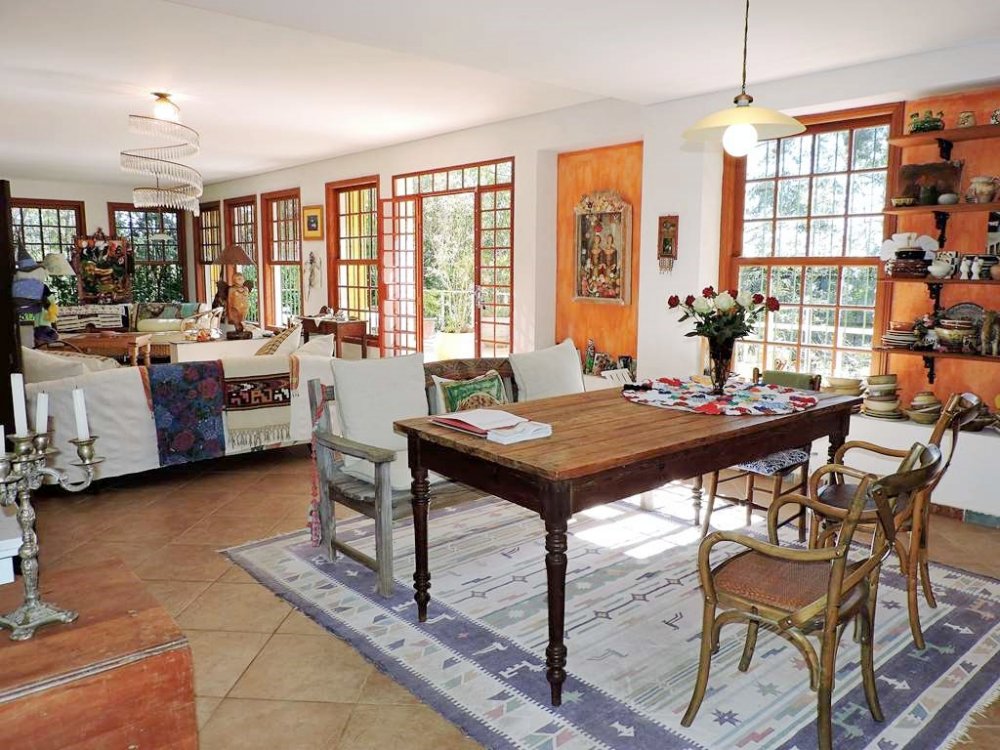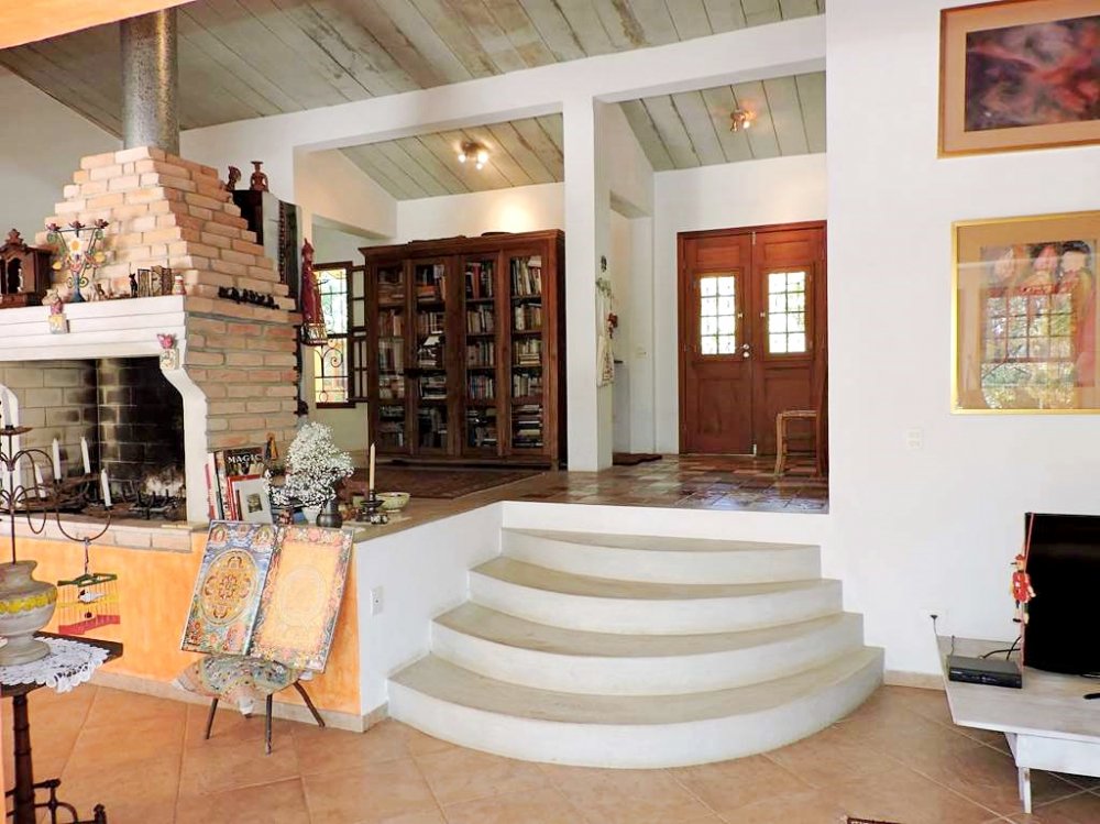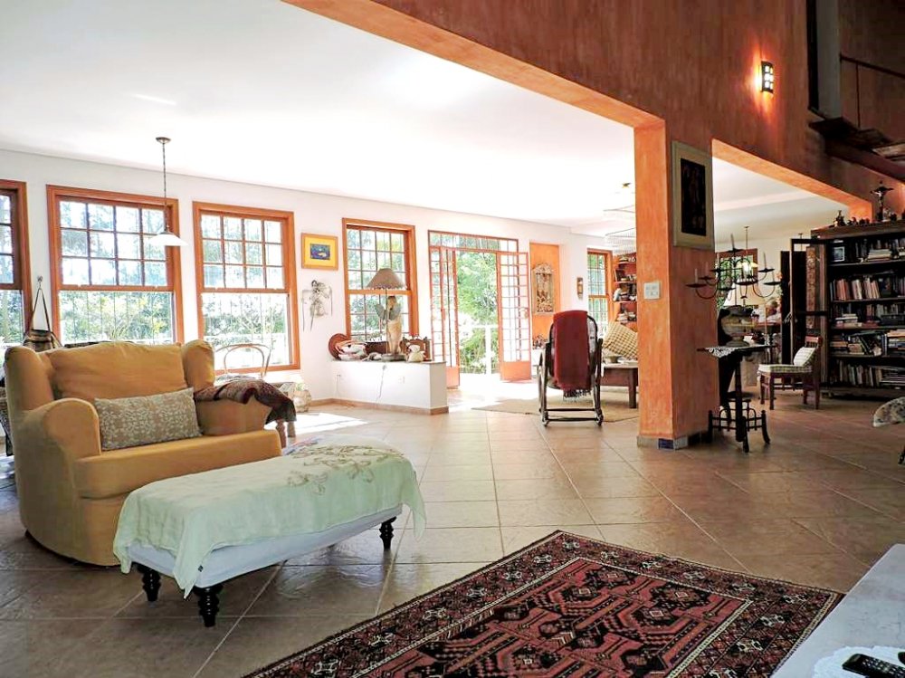 Living para 5 ambientes integrados (andar intermediário), com espaços para TV, estar, lareira, almoço e jantar. Voltados para um grande terraço em frente à mata.