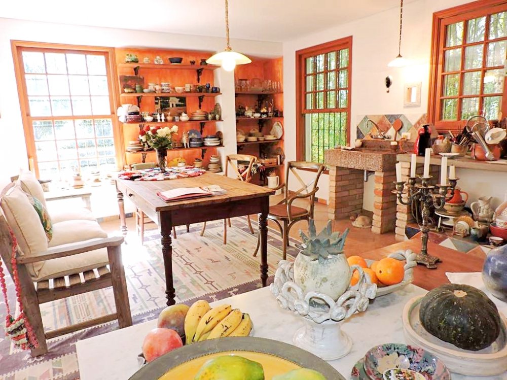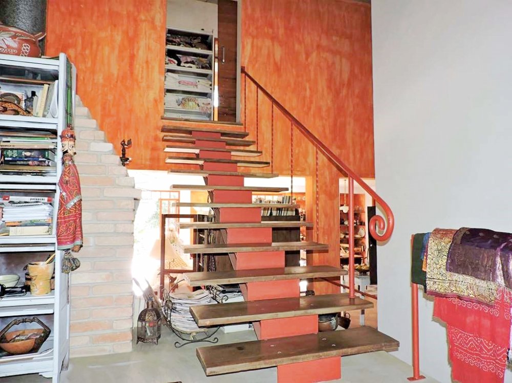 1 suíte no piso inferior, ligada ao salão multiuso (espaço reversível para mais 2 suítes), com 4 ambientes, ventilador, banheiro, pátio externo e mesa de alvenaria. Para festas, escritório, atelier, jogos, academia, música, brinquedoteca e cinema.