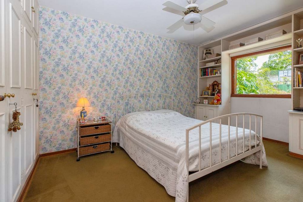 Edícula para funcionários ou caseiro: 2 quartos com armários, portas balcão veneziana em madeira e vidro, piso em tacos de madeira, 1 banheiro e tanque externo.