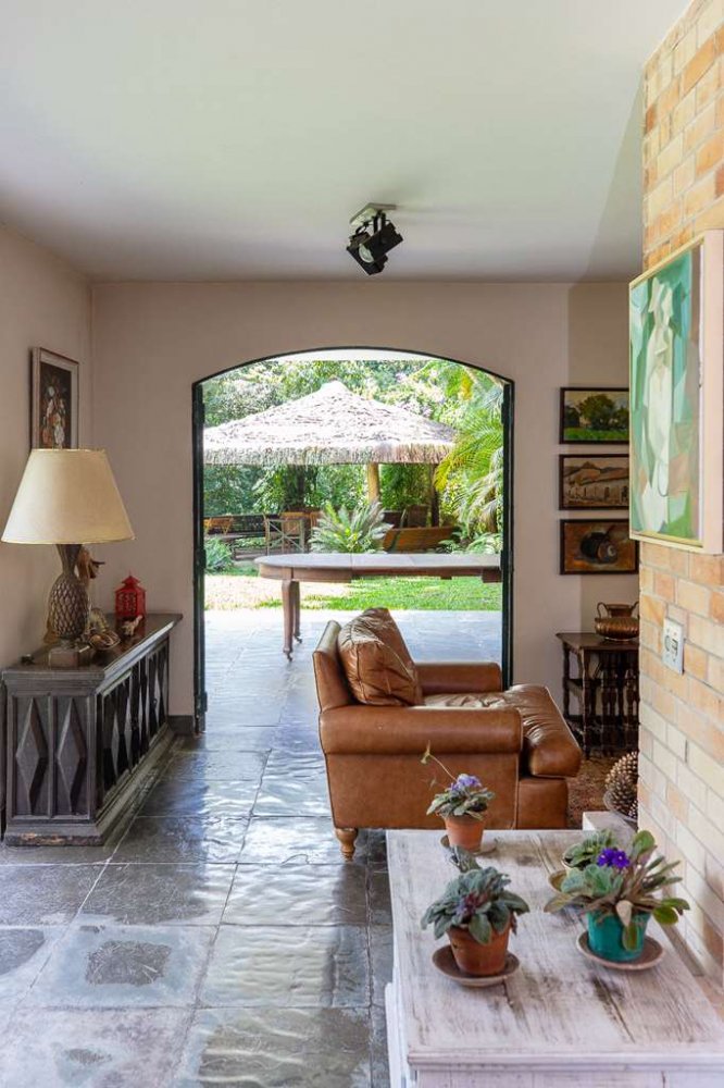SALÃO MULTIUSO COMPLETO integrado ao jardim. Ideal para festas, jogos e música. Com varanda, lareira dupla face, 3 sofás de alvenaria, bar, balcão, armários de madeira e copa com bancada e pia inox, adega e despensa.