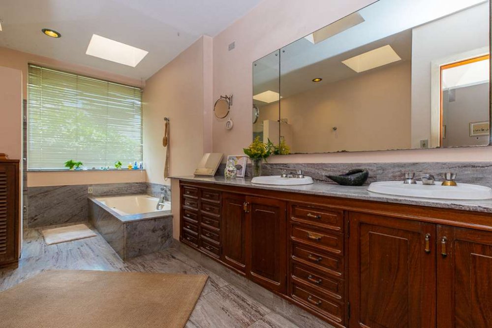 Banheiros com espelho tampos em mármore, box de vidro e bidê, das suítes americanas com 2 cubas e 1 com banheira. A máster 1 com 2 cubas e hidro panorâmica.