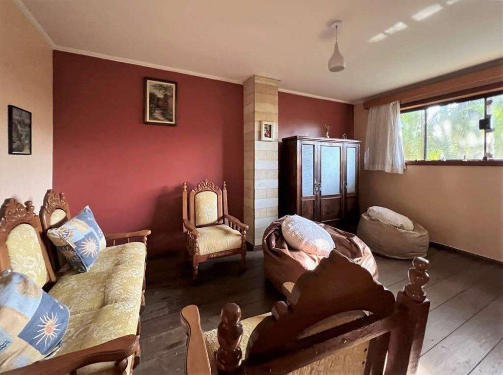 Salas de jantar com armário para louças e prataria, bar, estar, lareira em tijolos e biblioteca.