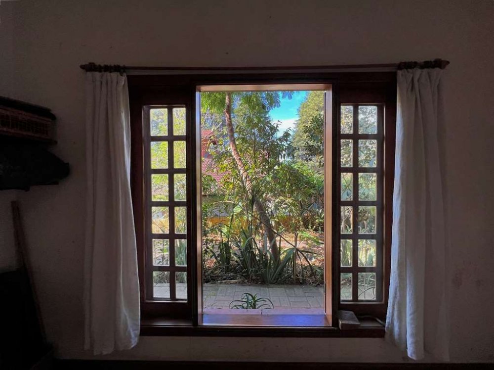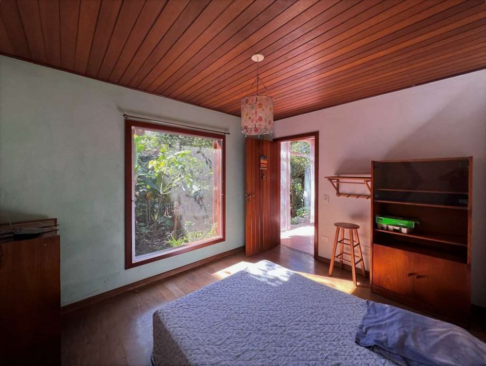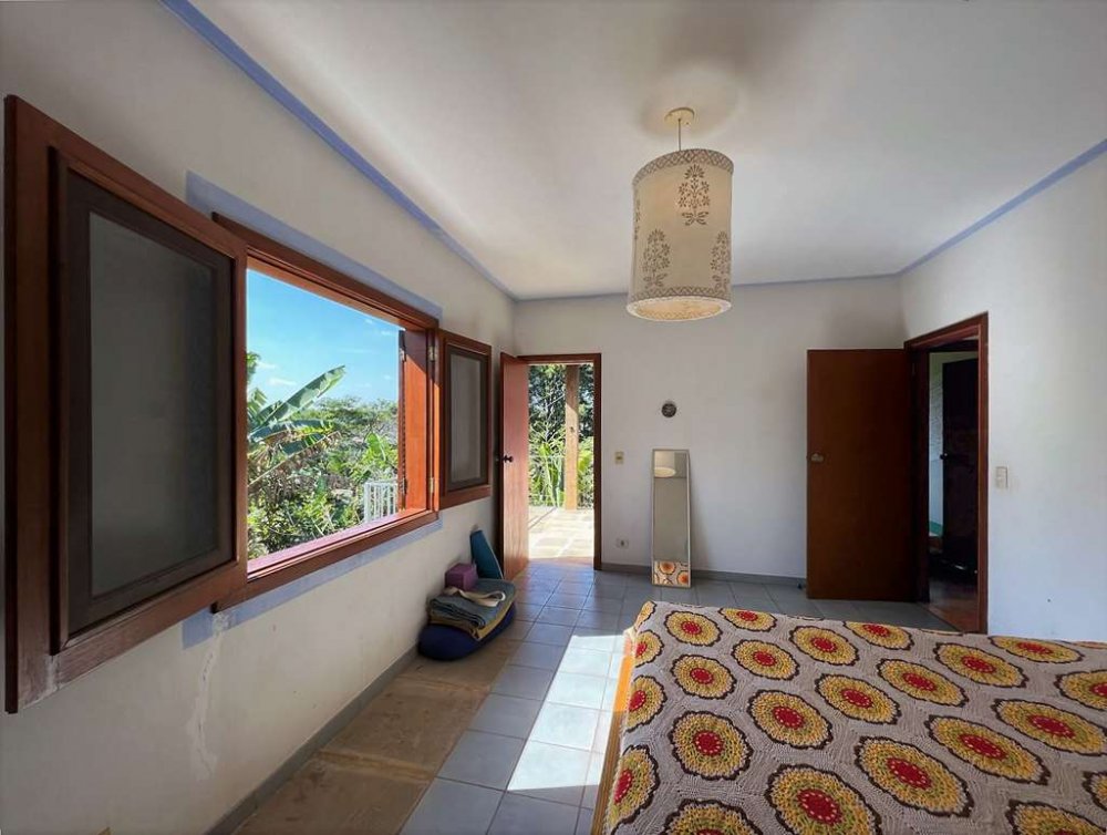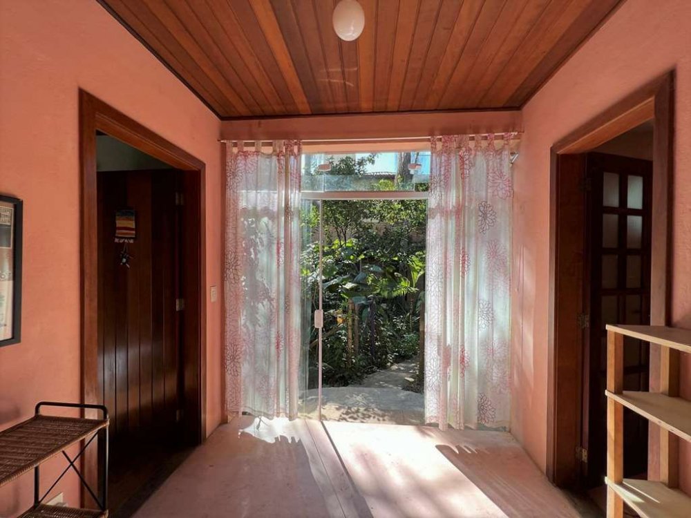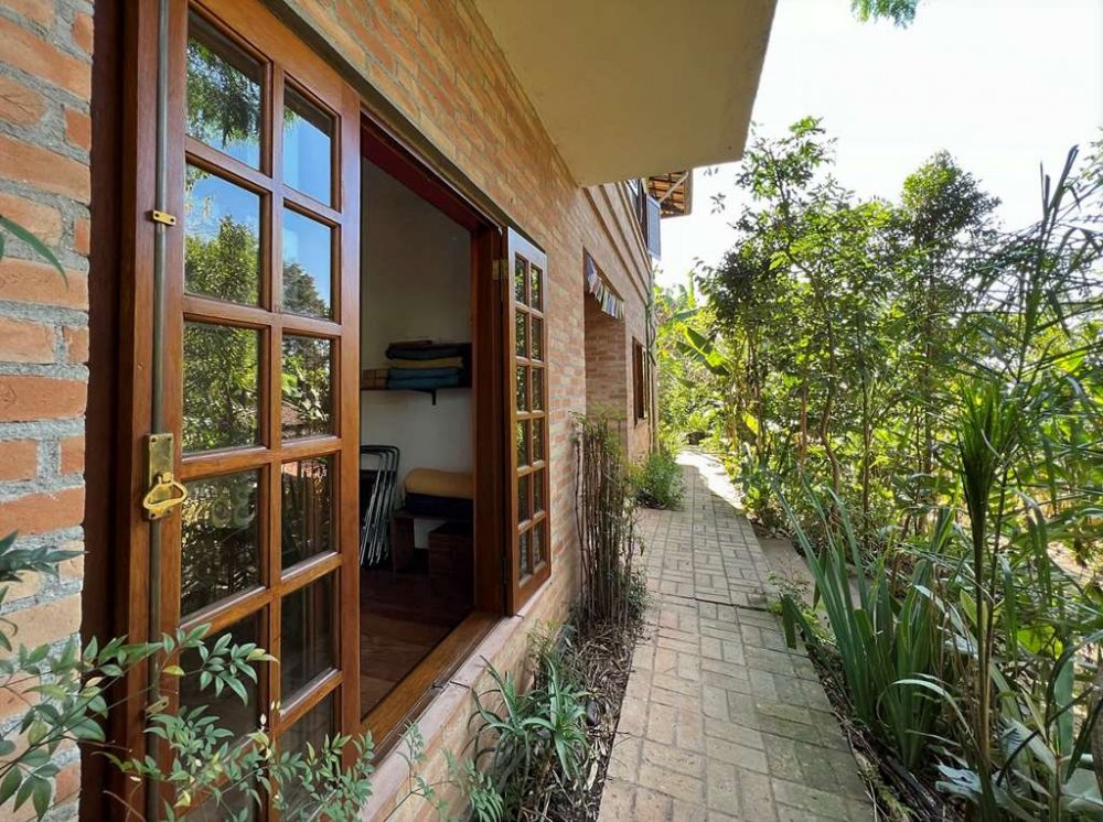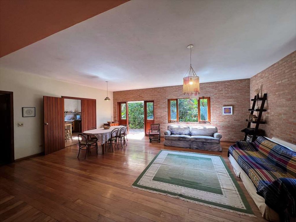 Living para 4 ambientes voltados para o quintal com agrofloresta formada.