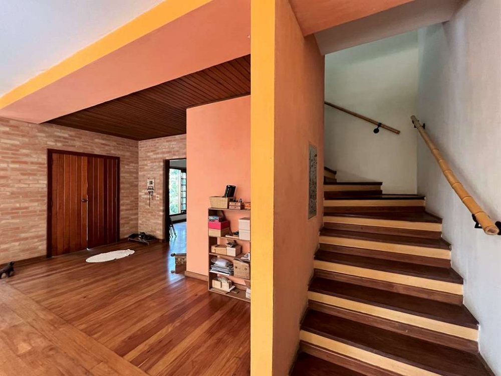Escada de alvenaria, revestida em madeira Jatobá e corrimão de bambu.