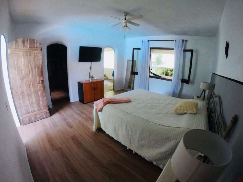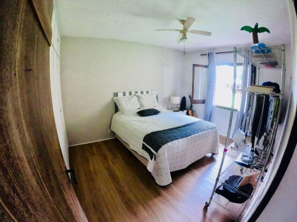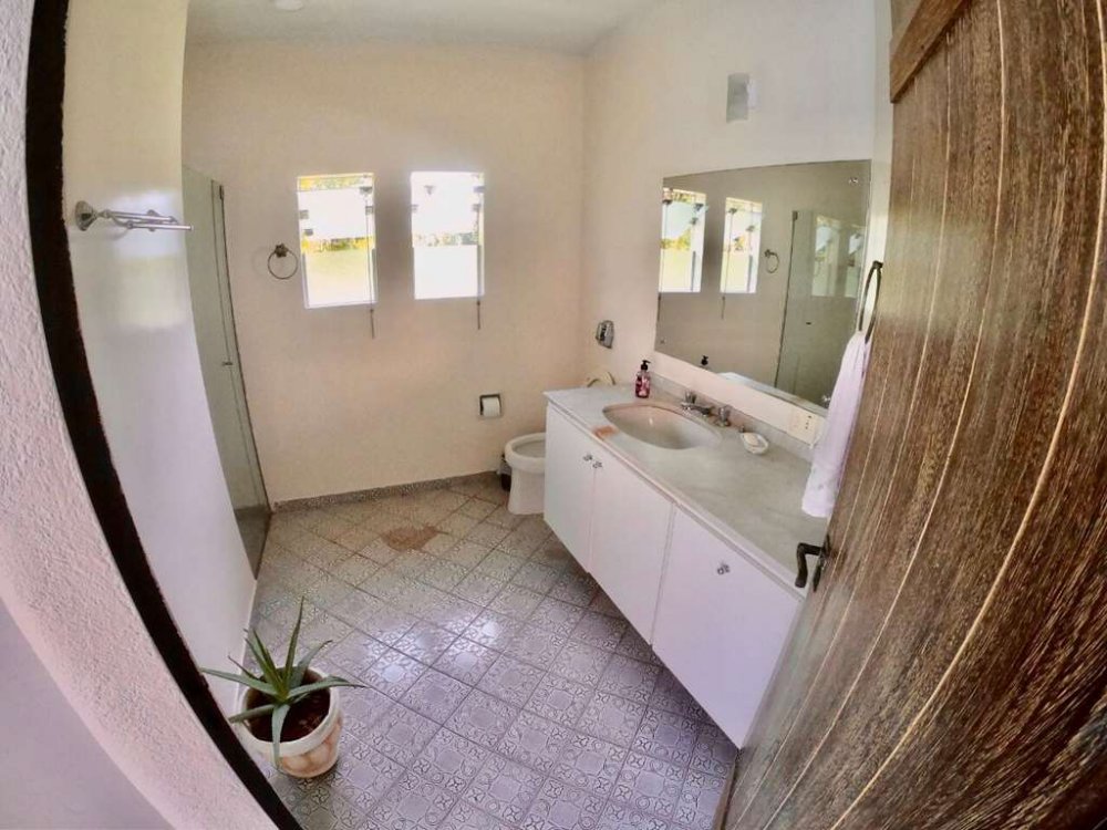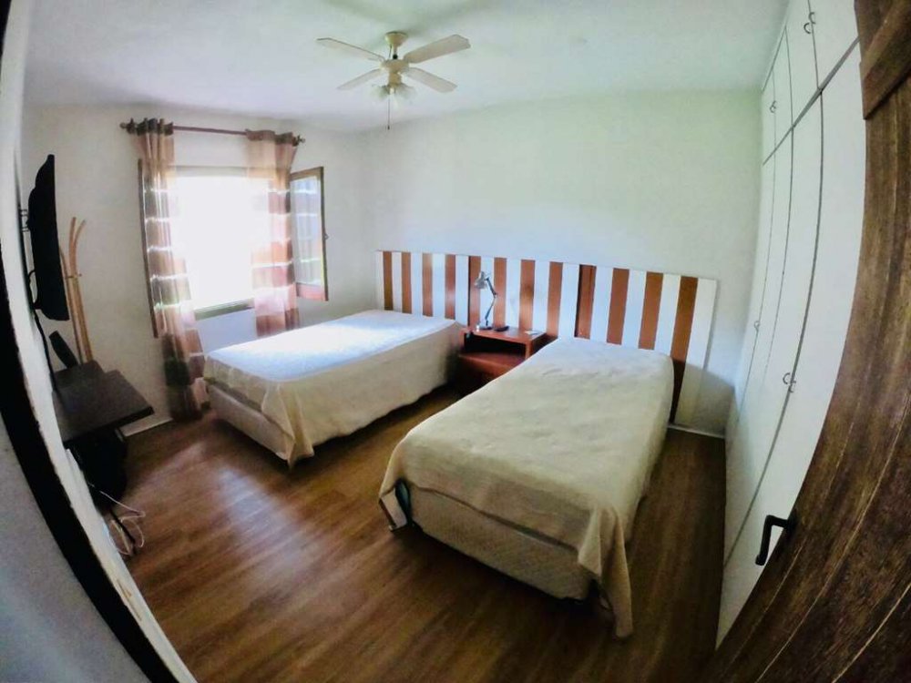 1 suíte de hóspede com armários, banheiro com box de vidro e gabinetes, além de ar condicionado. Quarto localizado próximo à garagem para maior comodidade dos convidados.