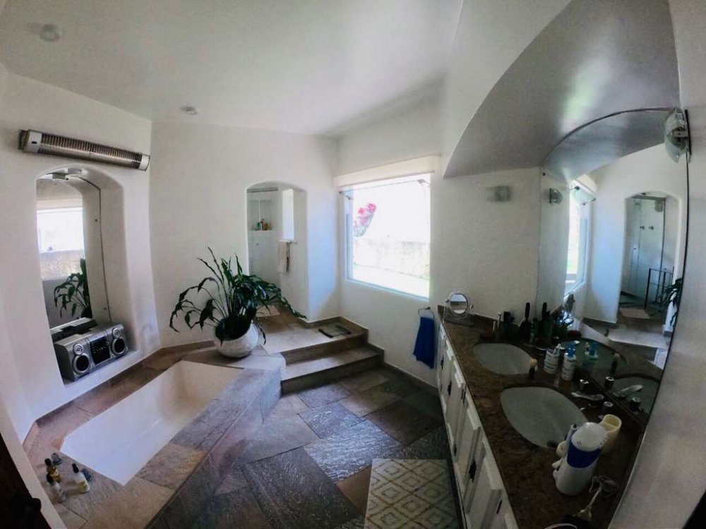 1 suíte máster com closet revestido, ventilador de teto e sala de banho envidraçada com banheira de alvenaria, 2 cubas, gabinetes, espelhos e aquecedor ambiente.