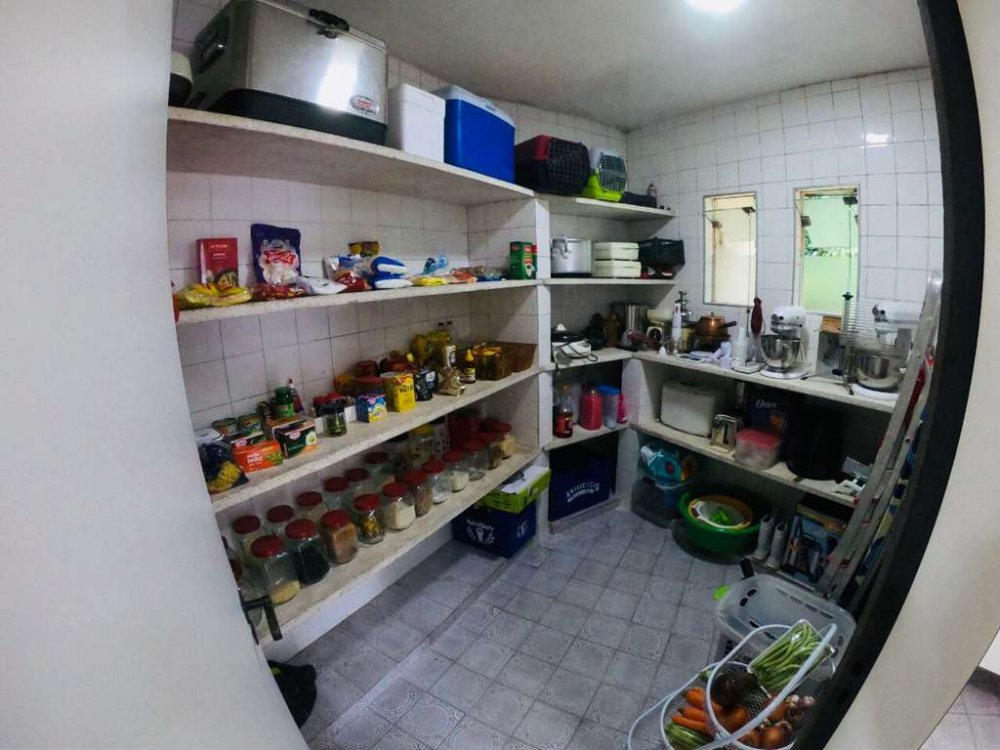 Área de serviço aberta e fechada com lavanderia, tanque, armários e despensa.