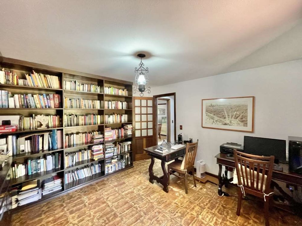 Sala íntima com lareira, estantes, living para 3 ambientes: estar, bar e jantar