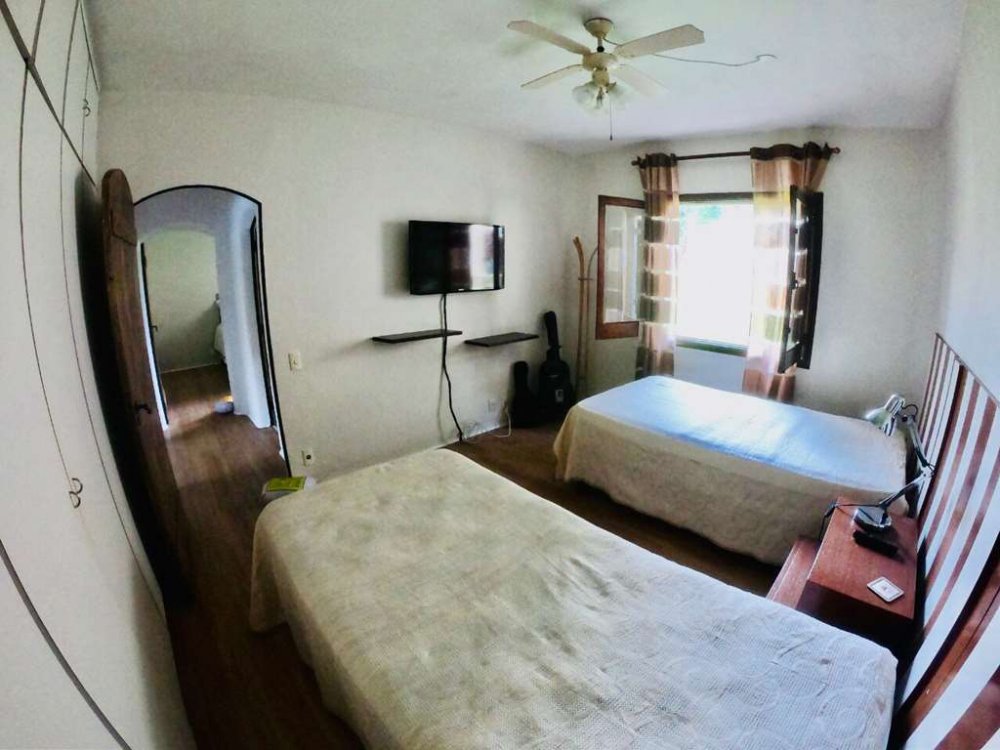 1 suíte de hóspede com armários, banheiro com box de vidro e gabinetes, além de ar condicionado. Quarto localizado próximo à garagem para maior comodidade dos convidados.