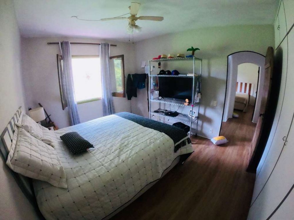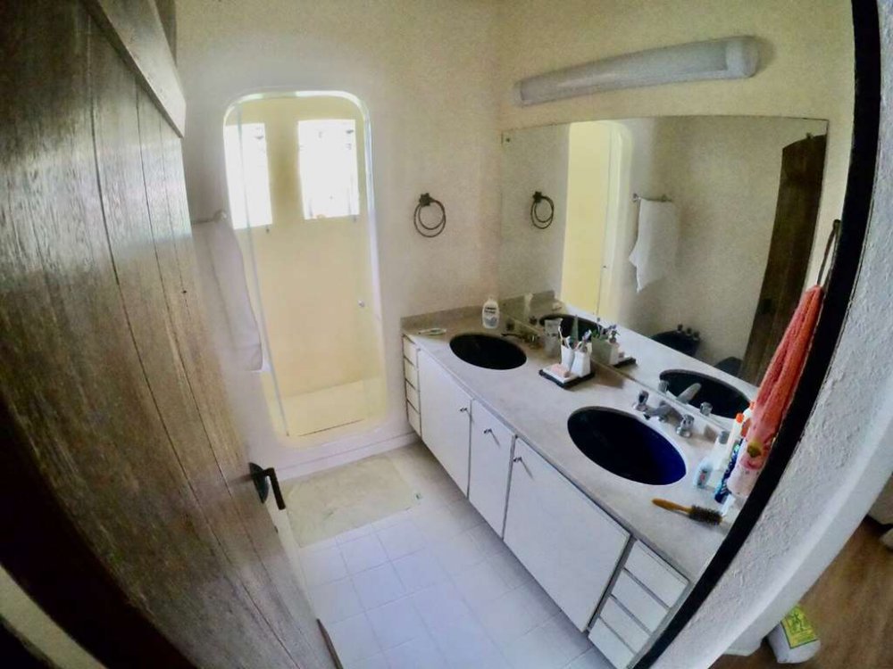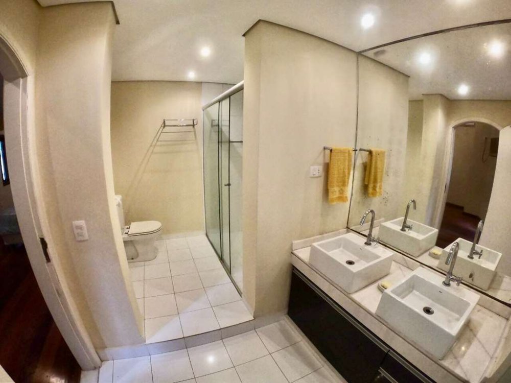 1 suíte máster com closet revestido, ventilador de teto e sala de banho envidraçada com banheira de alvenaria, 2 cubas, gabinetes, espelhos e aquecedor ambiente.
