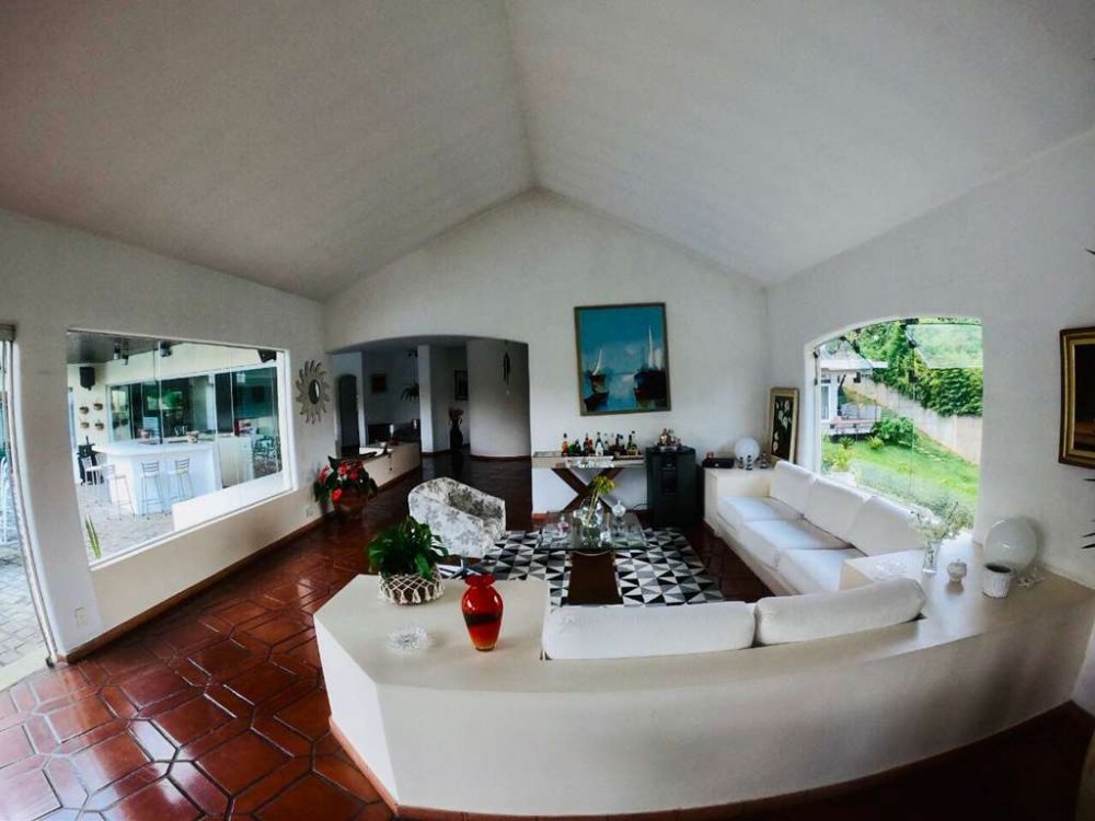 Living para 5 ambientes envidraçados e espaçosos, alguns com sofás em alvenaria. Todos voltados para o lazer da piscina, quintal, jardim e mirante com linda vista.