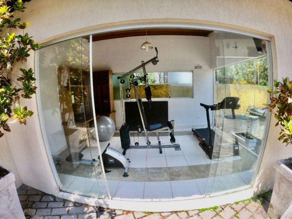Academia envidraçada equipada com TV, esteira, remo e aparelho multiuso.