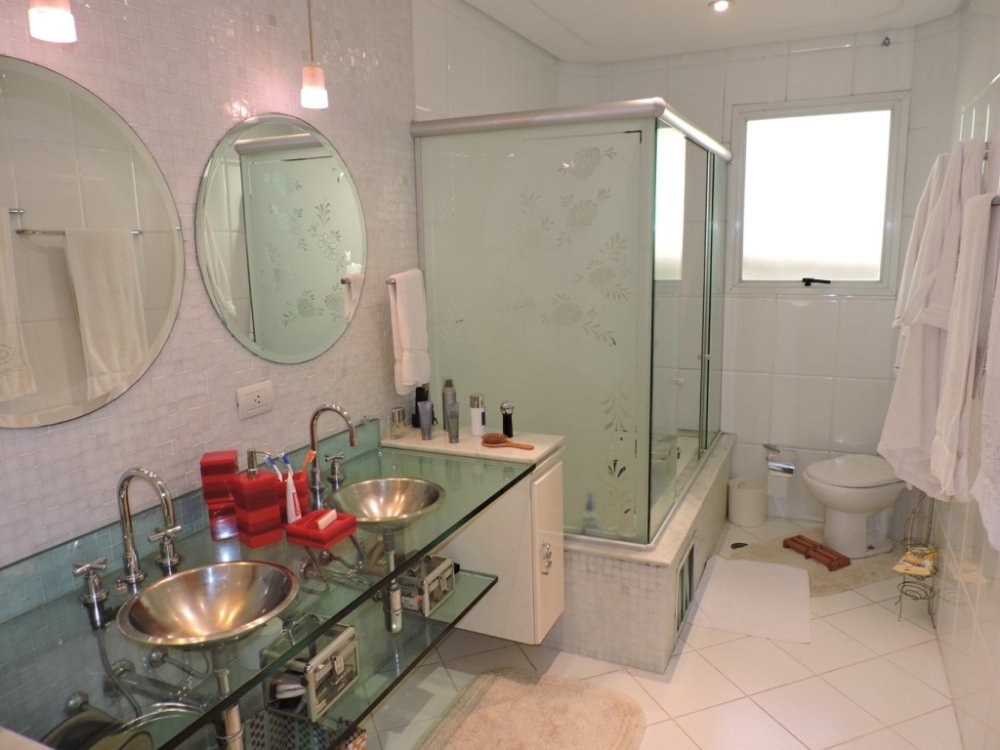 Banheiros com gabinetes e box de vidro, sendo o da máster com 2 cubas e hidro.