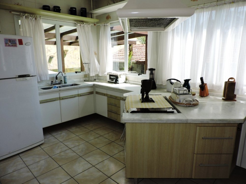 Copa / cozinha americana ampla, com balcão e repleta de armários planejados. Ilha com fogão, coifa e vista para o jardim.