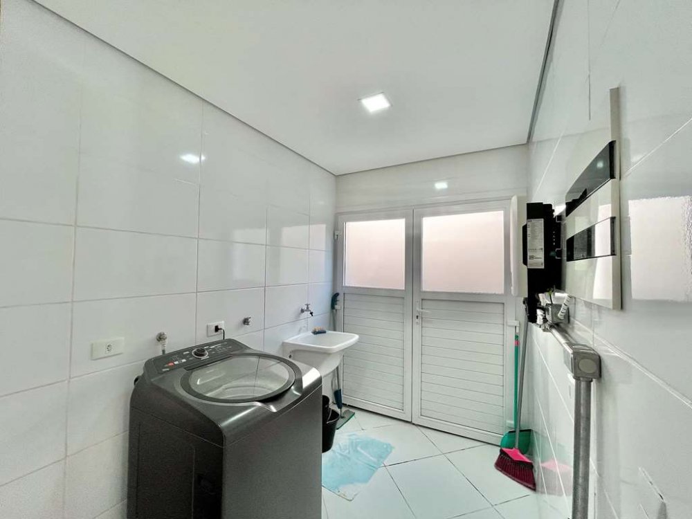 Área de serviço aberta ensolarada e lavanderia fechada com tanque.