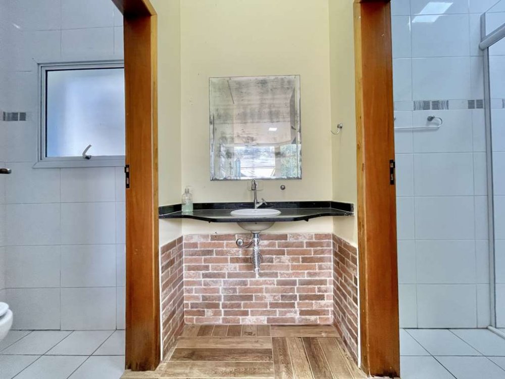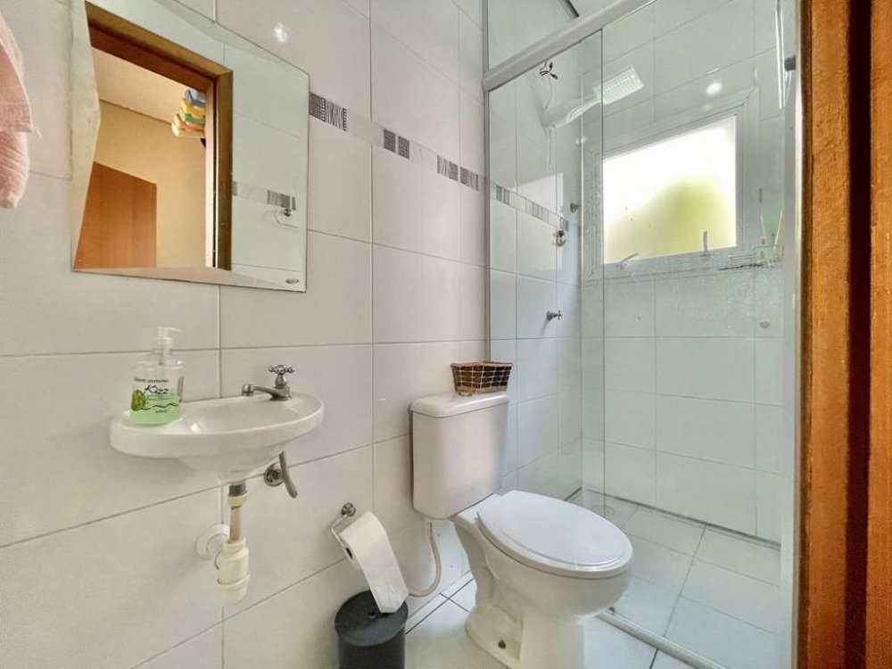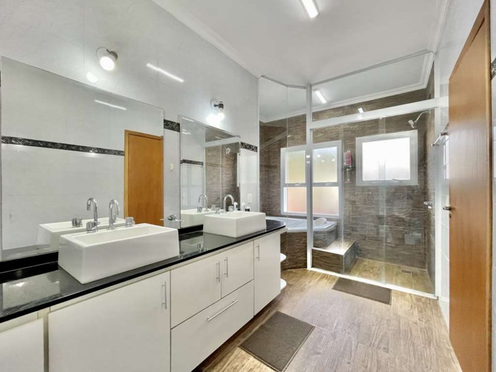 Banheiros com espelho, gabinetes e box de vidro (2 até o teto). A máster com 2 cubas e hidro dupla.