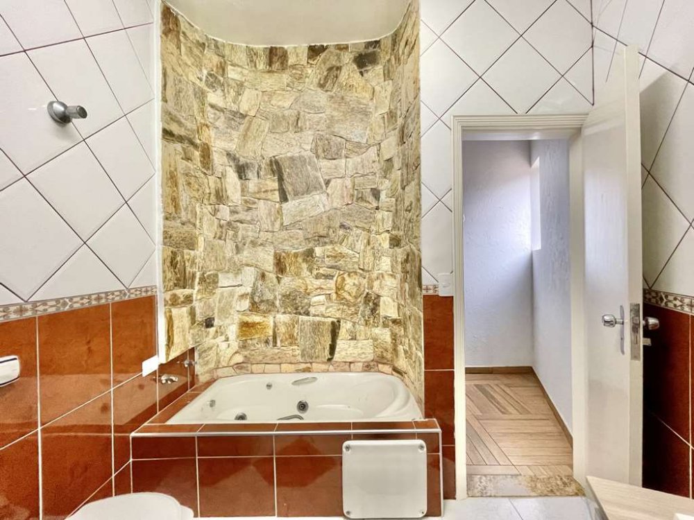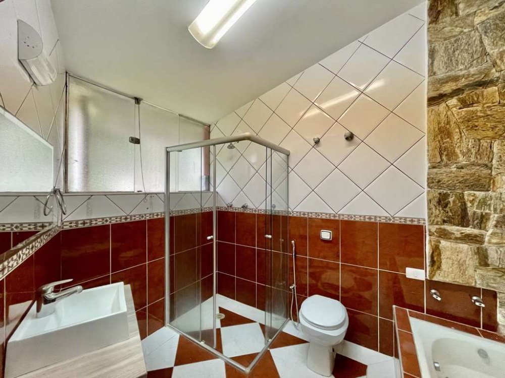 Banheiros com espelho e box de vidro, sendo a máster com box de vidro , parede de pedra, 2 cubas e hidro.