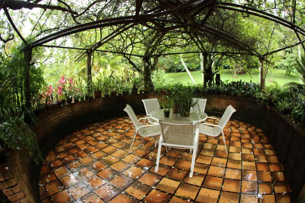 Jardim com paisagismo formado e frutíferas: Banana prata, caqui, jabuticaba, pitanga, abacate, cereja do mato, carambola, graviola, limão, laranja e, manga coquinho.