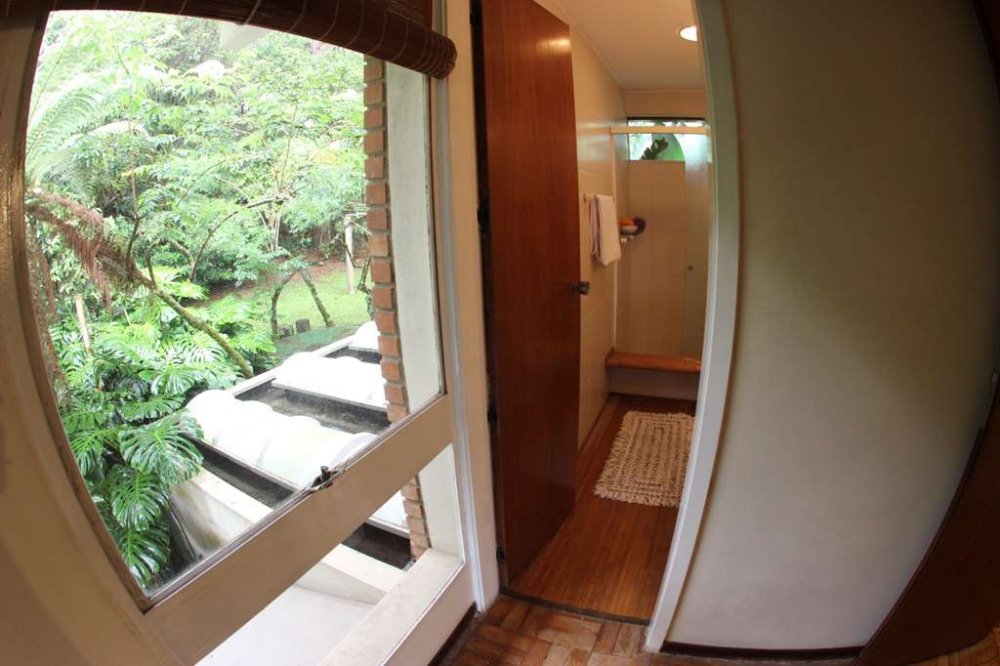 Portas e janelas em madeira e vidro, com venezianas nos quartos.