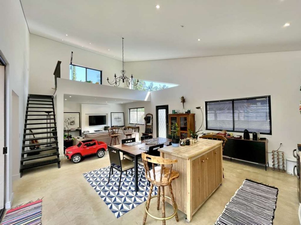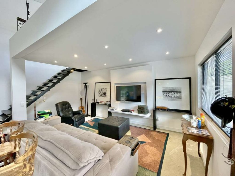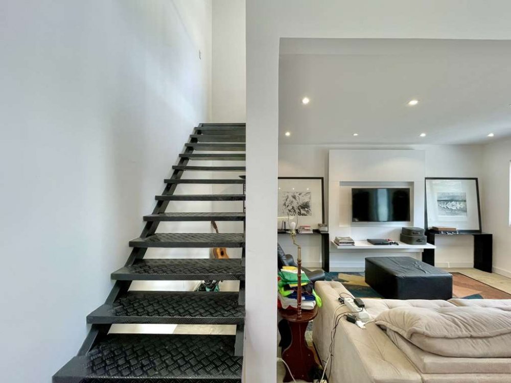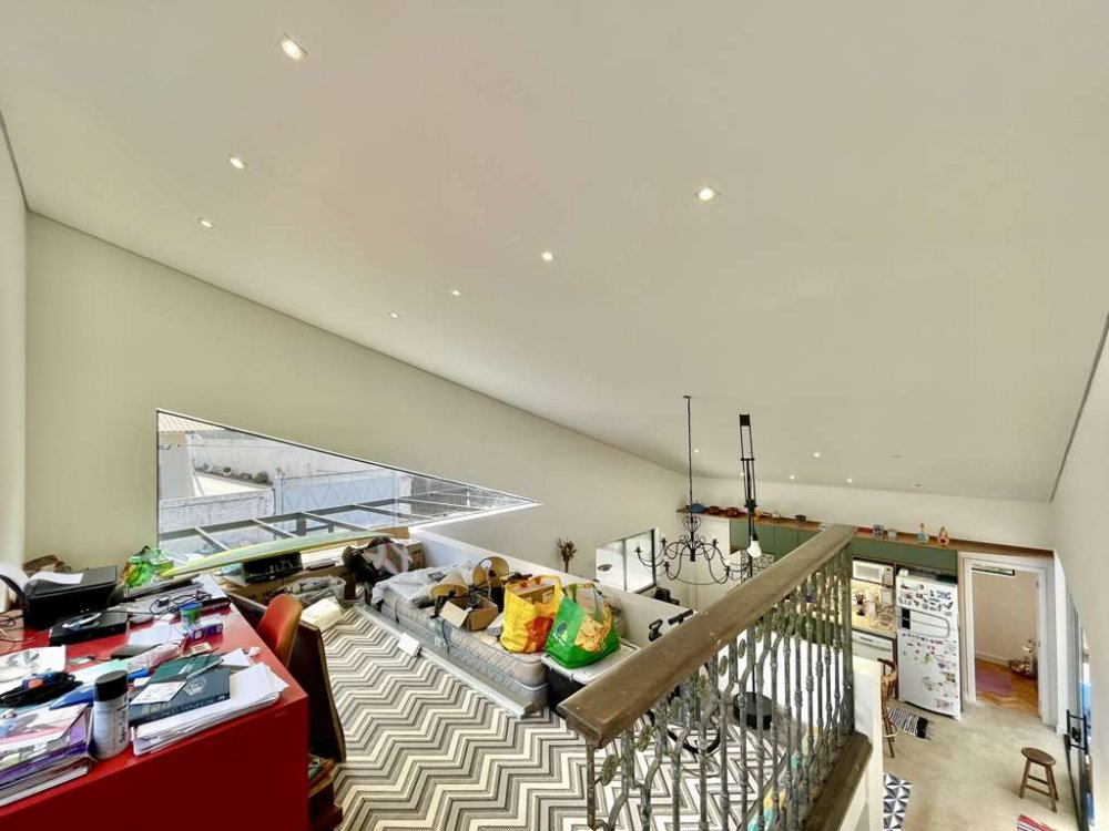 Mezanino com acesso por escada de ferro, espaço ideal para escritório, estudos e TV.