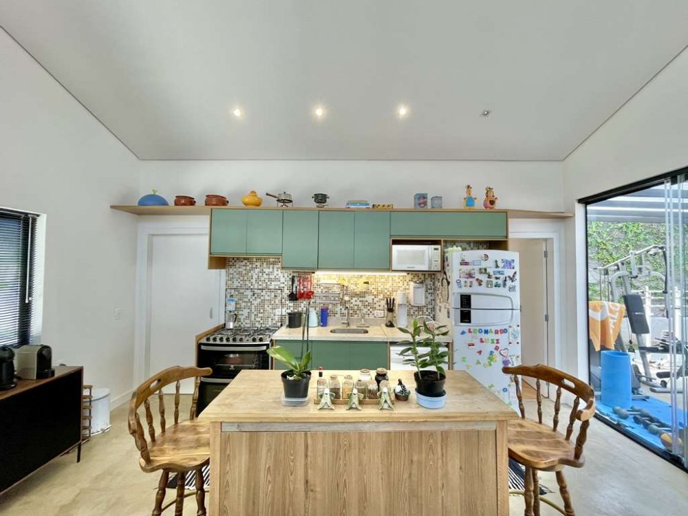 Estar, TV, jantar / bar e cozinha integrada planejada com bancada e ilha.