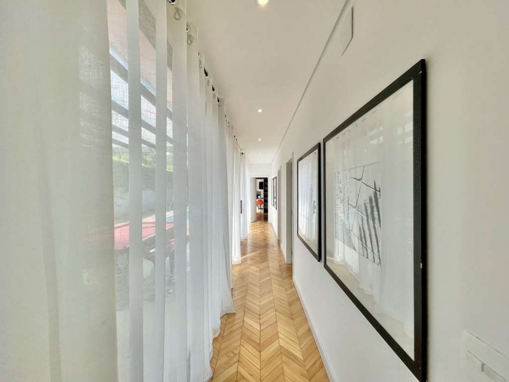 Corredor íntimo totalmente envidraçado, integrando as 3 suítes diretamente ao lazer e piscina.