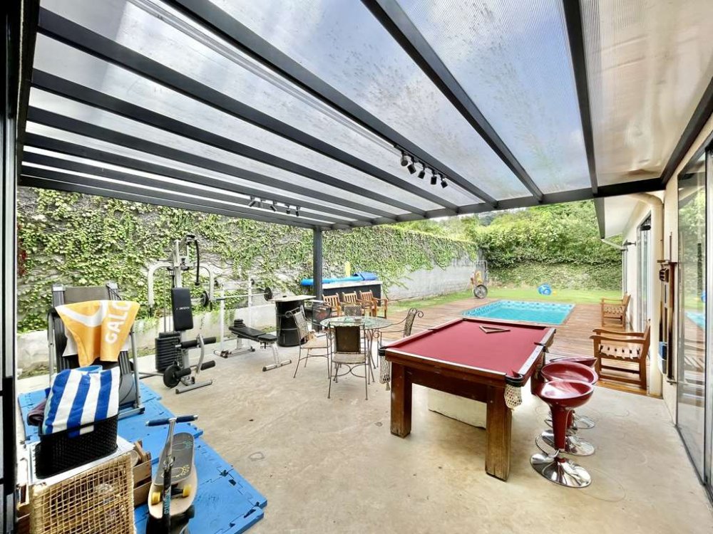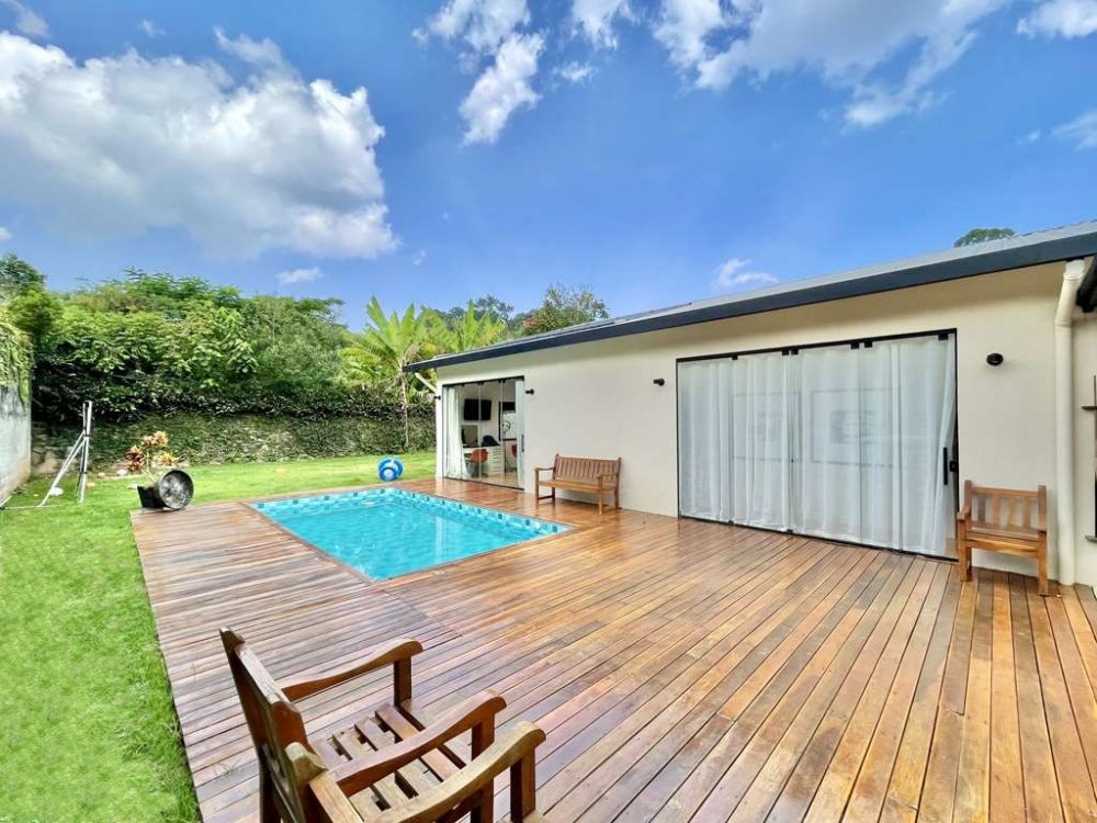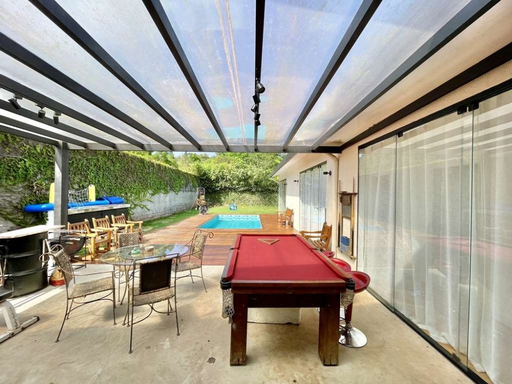 Piscina revestida em vinil, com aquecimento solar, grande deck em Ipê, solarium e casa de máquinas.