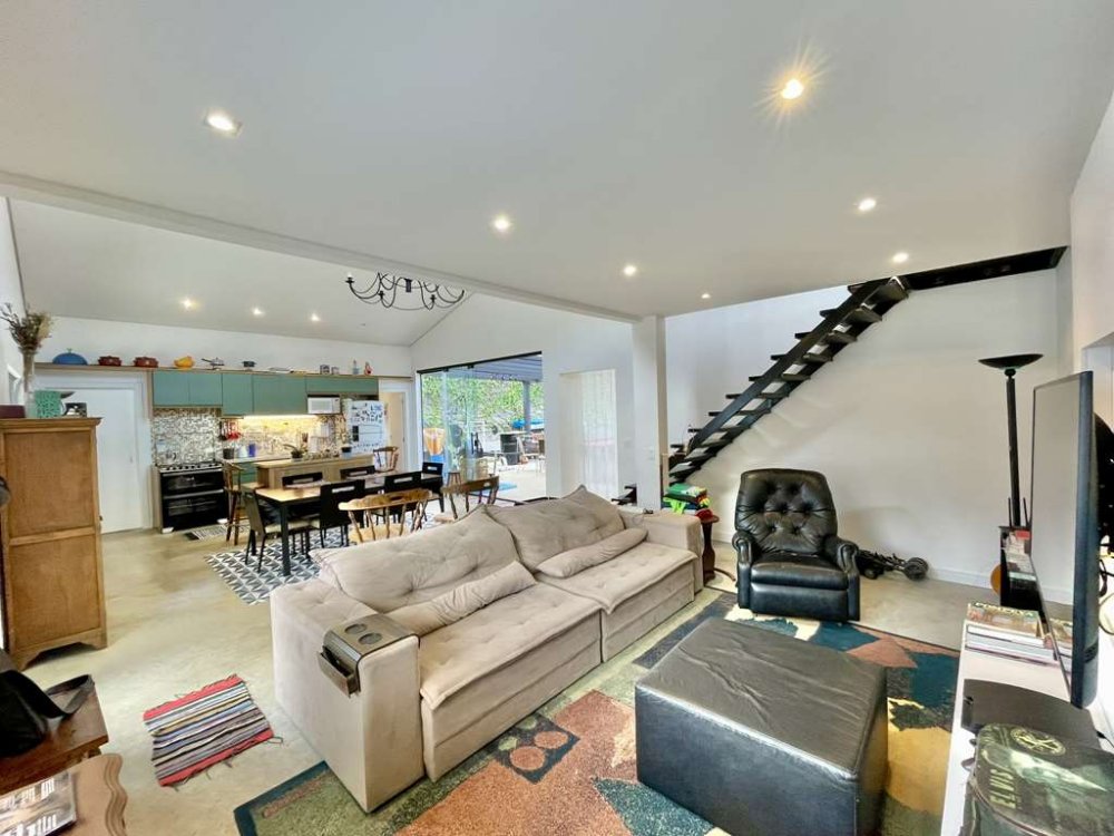 Living totalmente integrado, para 4 ambientes, voltados para o lazer com uma grande varanda, piscina, quintal e jardim.
