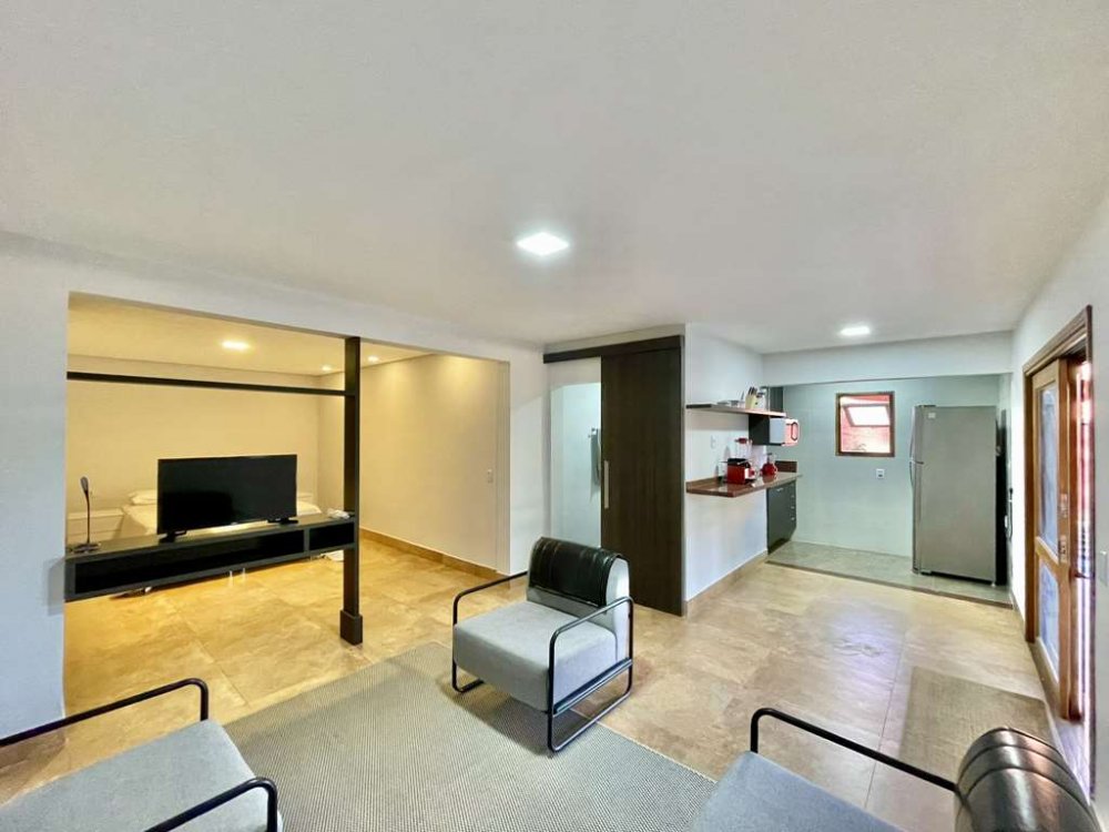 1 suíte LOFT DE HÓSPEDES com acesso externo, saleta, quarto com armário, banheiro com espelho e box de vidro e copa com bancada, pia inox e torneira gourmet.