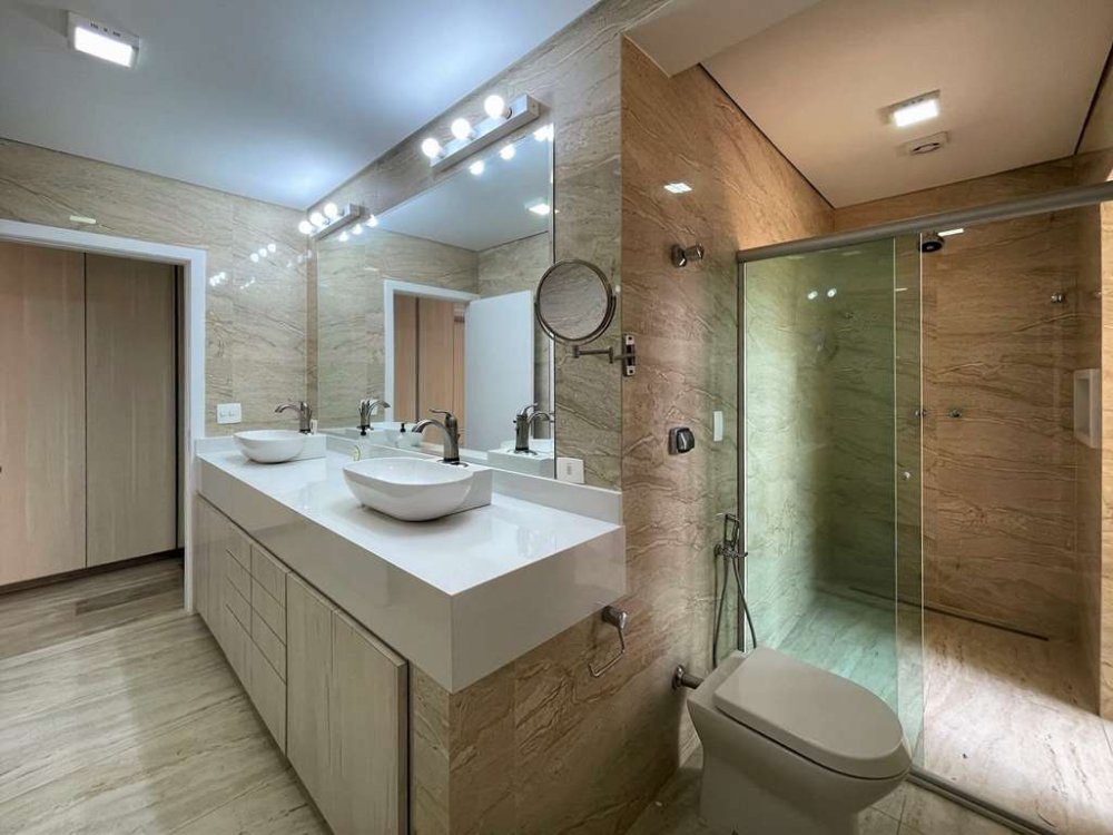 Banheiros: Com gabinetes, espelho e box de vidro, torneiras touch. A máster com 2 cubas e SPA EXTERNO com Jacuzzi para 4 pessoas e acesso direto pelo box da suíte.