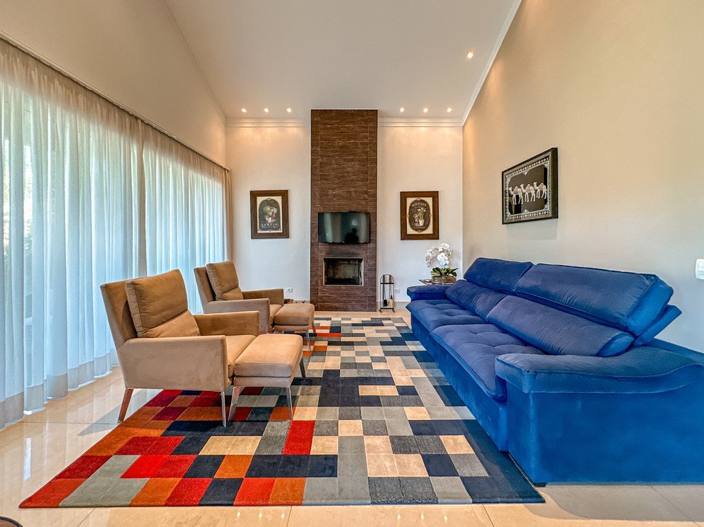 Living com pé direito duplo, integrando sala de estar com lareira, sala de jantar e sala de cinema/TV