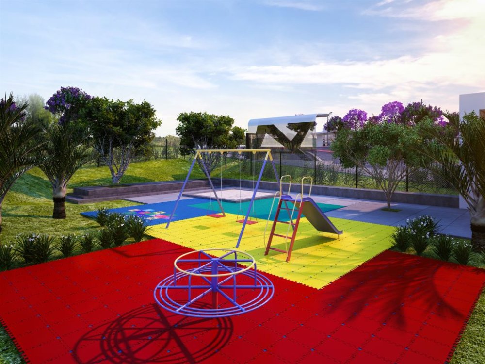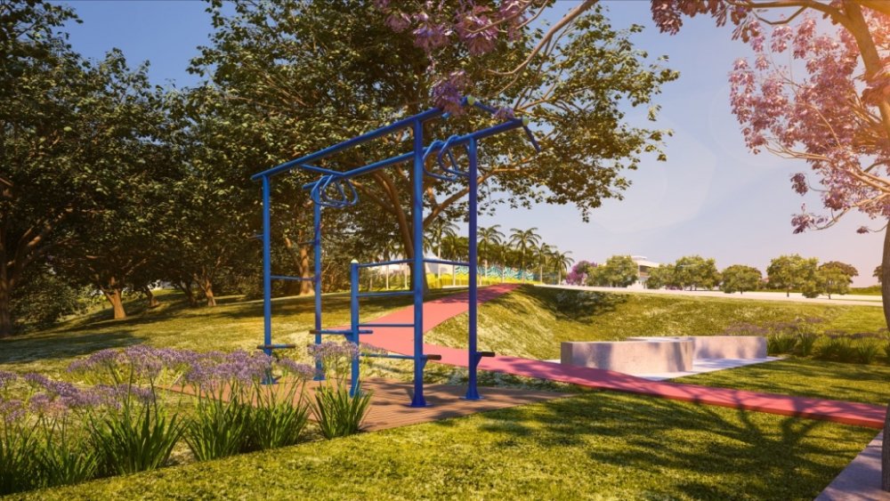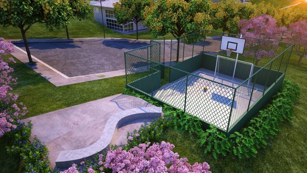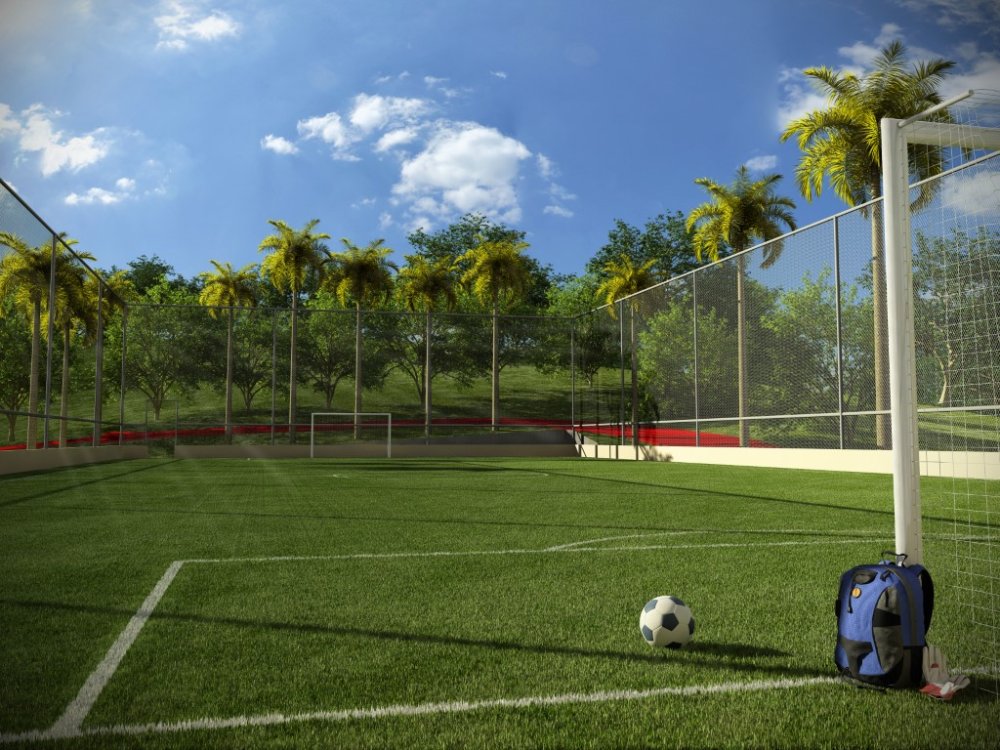 Praça com quadra de esportes, espaço playground, e campo de futebol