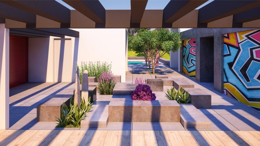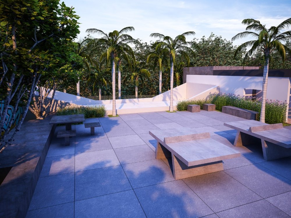 Deck de contemplação, mini quadra de vôlei e basquete, e espaço de alongamento