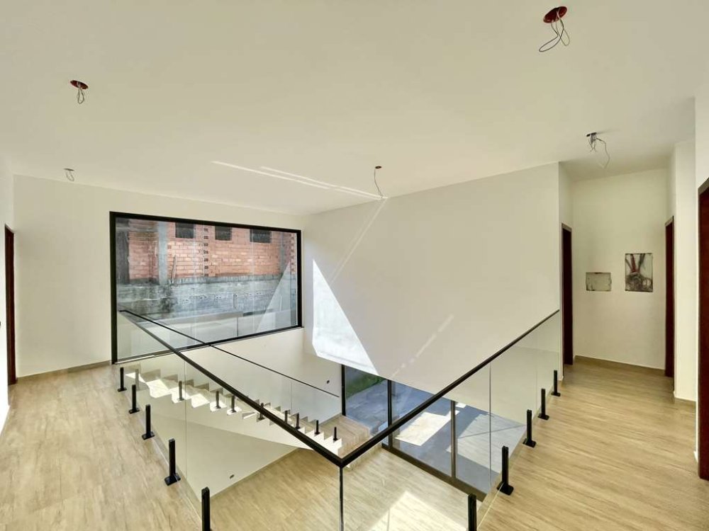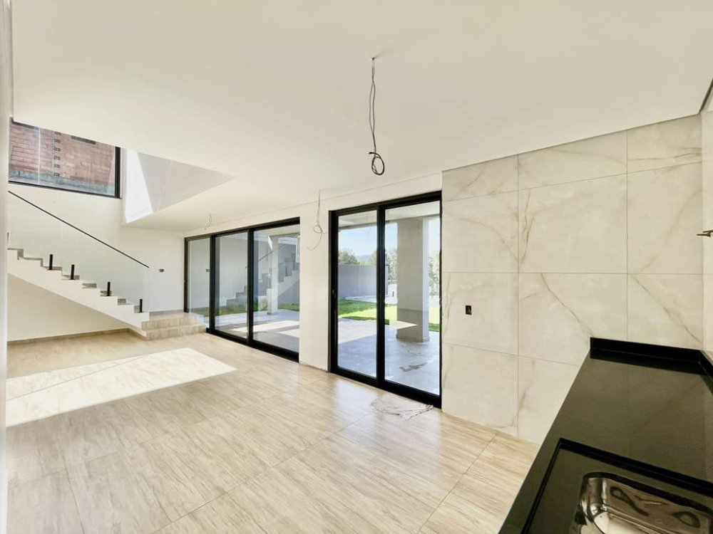 Design Moderno e Integrado: Com pé direito alto, a casa é envidraçada, proporcionando ambientes amplos e iluminados.