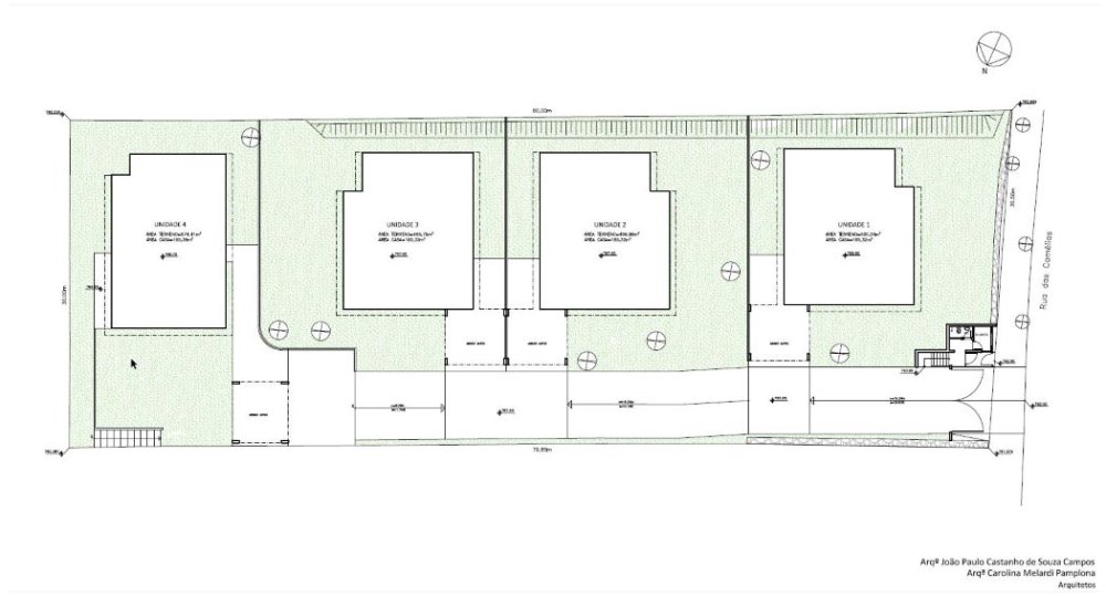 Residências Planejadas: O projeto aprovado contempla a construção de quatro casas térreas, cada uma com 185 m², oferecendo um design moderno e funcional, perfeito para atender às demandas do mercado atual.