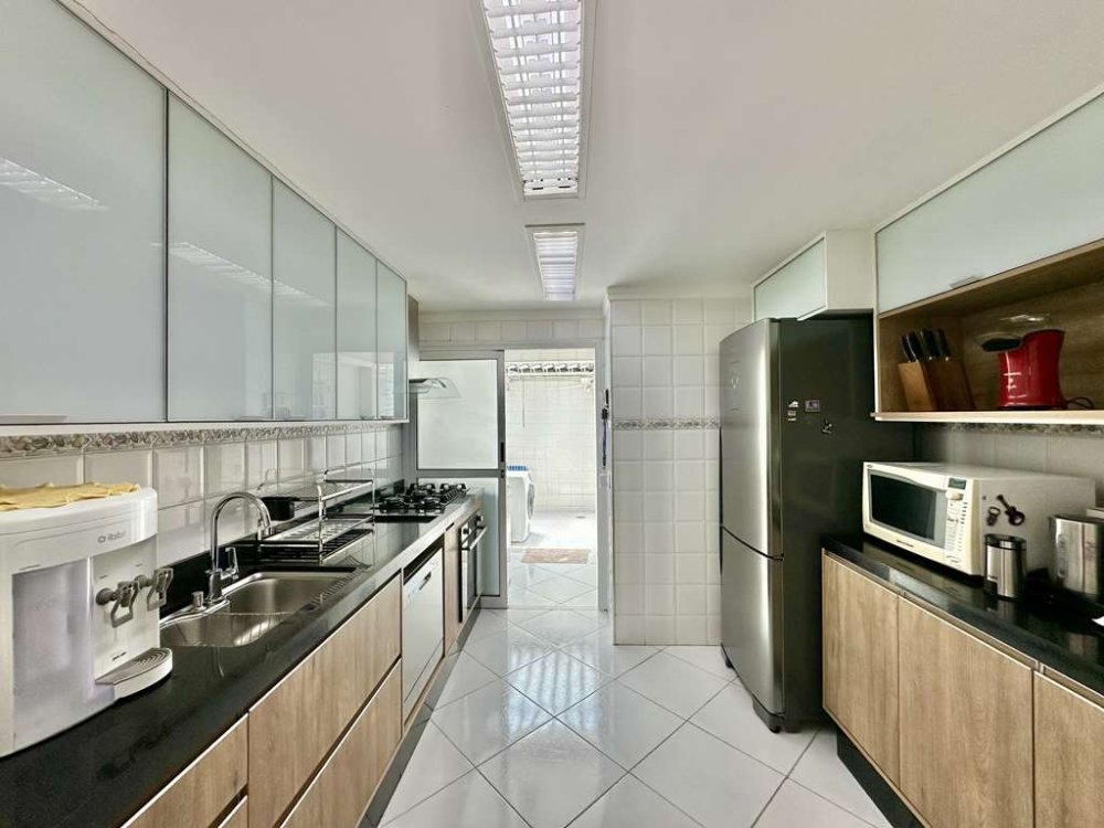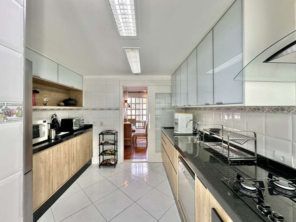 Cozinha integrada à sala de jantar, equipada com armários planejados, bancada em granito, fogão de cinco bocas com coifa inox e forno Electrolux embutidos.