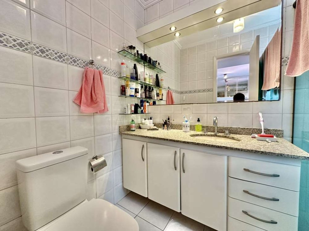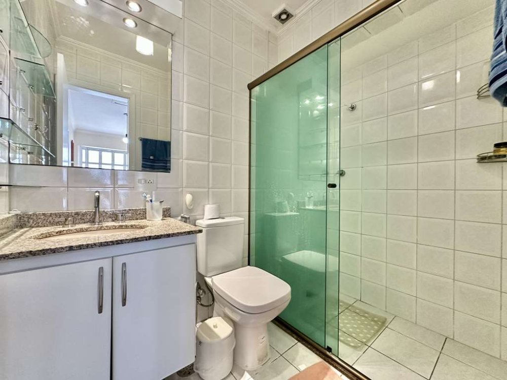 Banheiros com tampos em granito, espelhos, gabinetes e box de vidro.