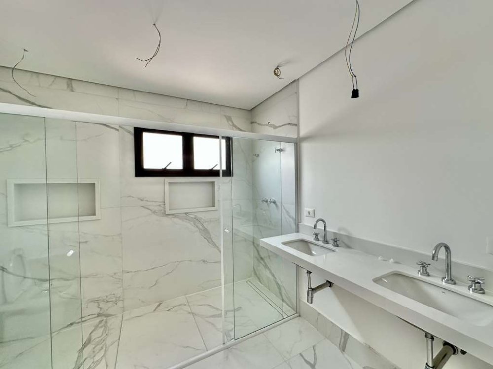 Suítes Confortáveis: Quatro suítes com persianas elétricas e preparação para ar-condicionado, sendo a suíte master com um amplo closet e banheiro com gabinetes, duas cubas, dois nichos e duas duchas.