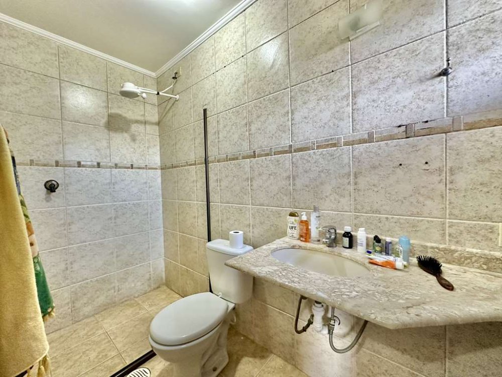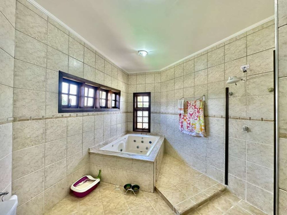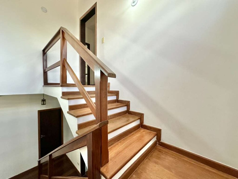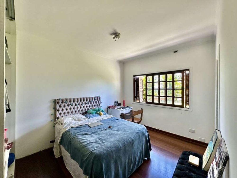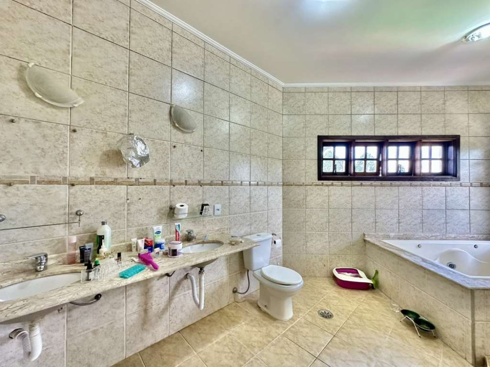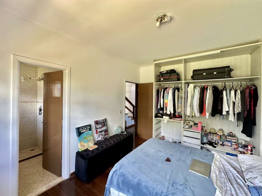 Área Íntima e Suítes: Três suítes espaçosas com armários, sendo duas no térreo e uma suíte master no piso superior, com 50m², grande closet para ele e ela, e varanda com vista até o Pico do Jaraguá. Banheiros bem equipados com espelhos, gabinetes, box de vidro e tampos em Travertino, com a suíte master oferecendo duas cubas e hidro dupla.