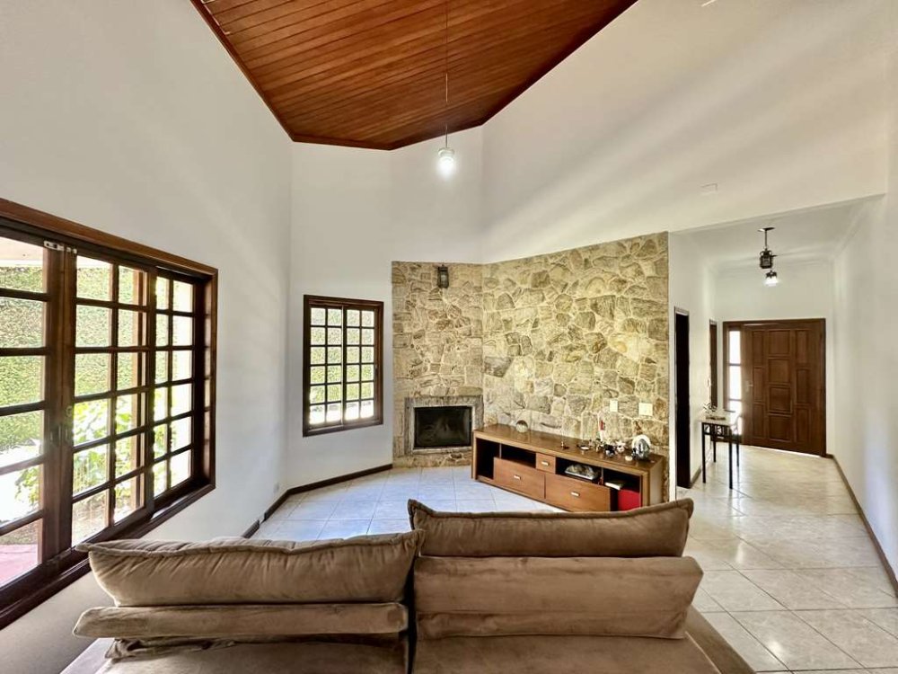 Living e Área Social: Living para quatro ambientes com pé direito alto, integrados à cozinha americana planejada e voltados para uma agradável varanda com jardim nos fundos. Espaços para jantar/bar, estar, TV e lareira, perfeitos para receber convidados.