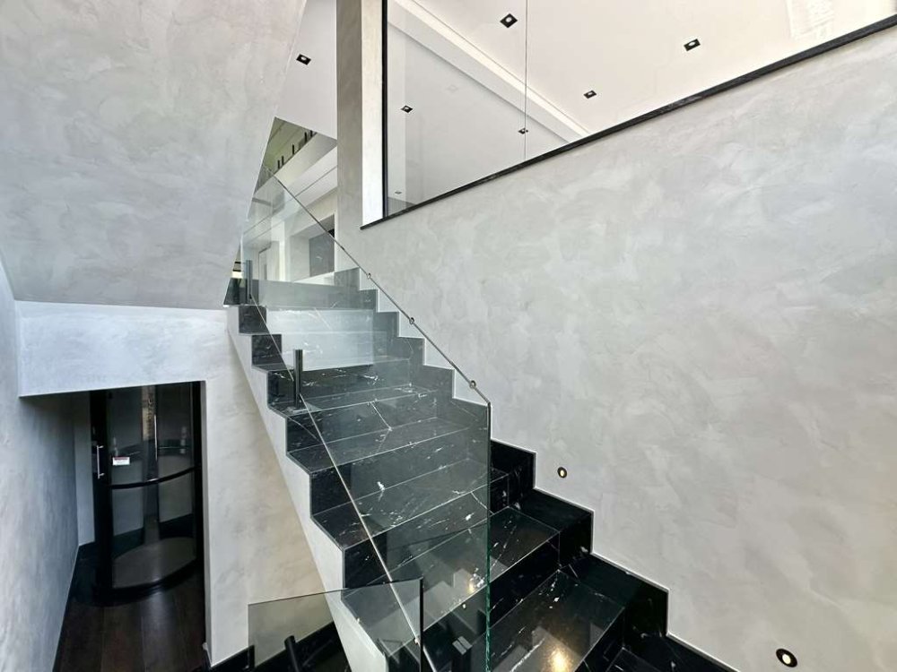 Escadas de Alvenaria Iluminadas: Design moderno e elegante com guarda corpo em vidro e metal.