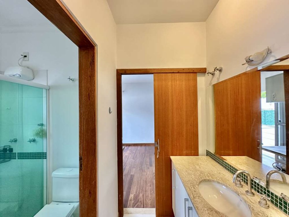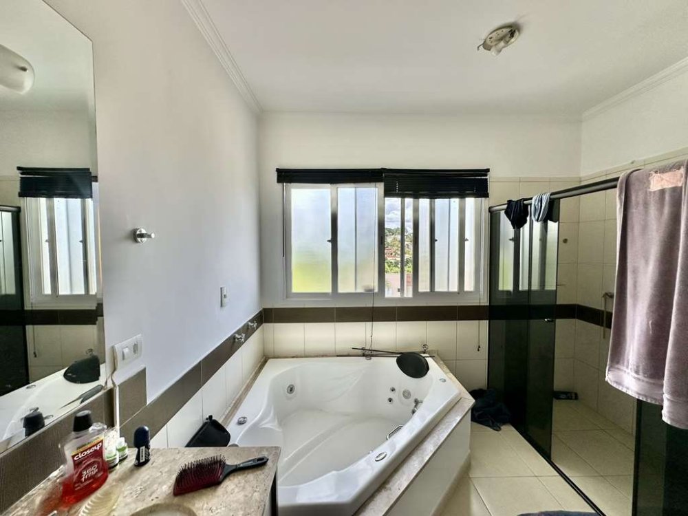 - Banheiros modernos com gabinetes e box de vidro, incluindo uma suíte máster com hidromassagem e box duplo para chuveiros.