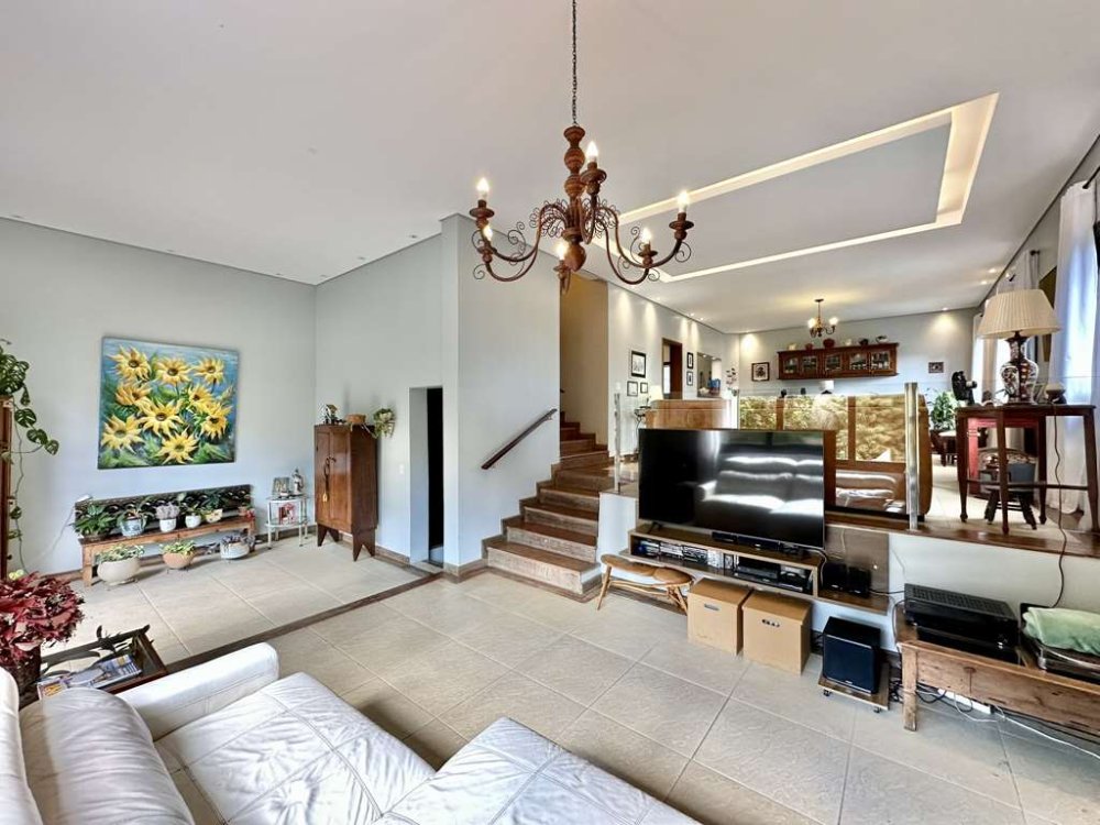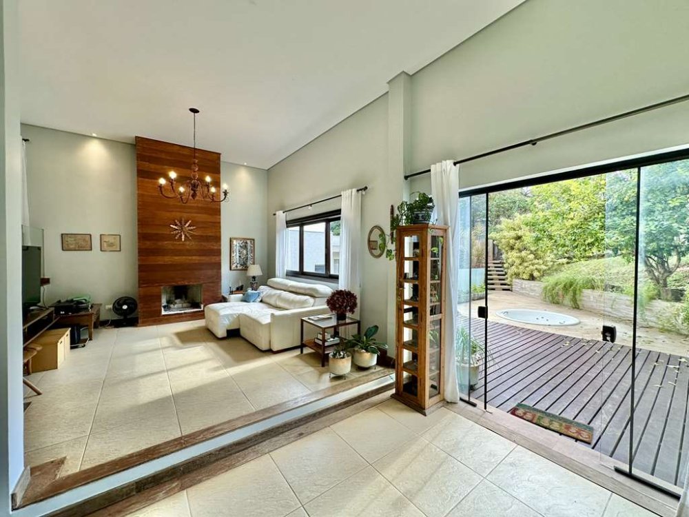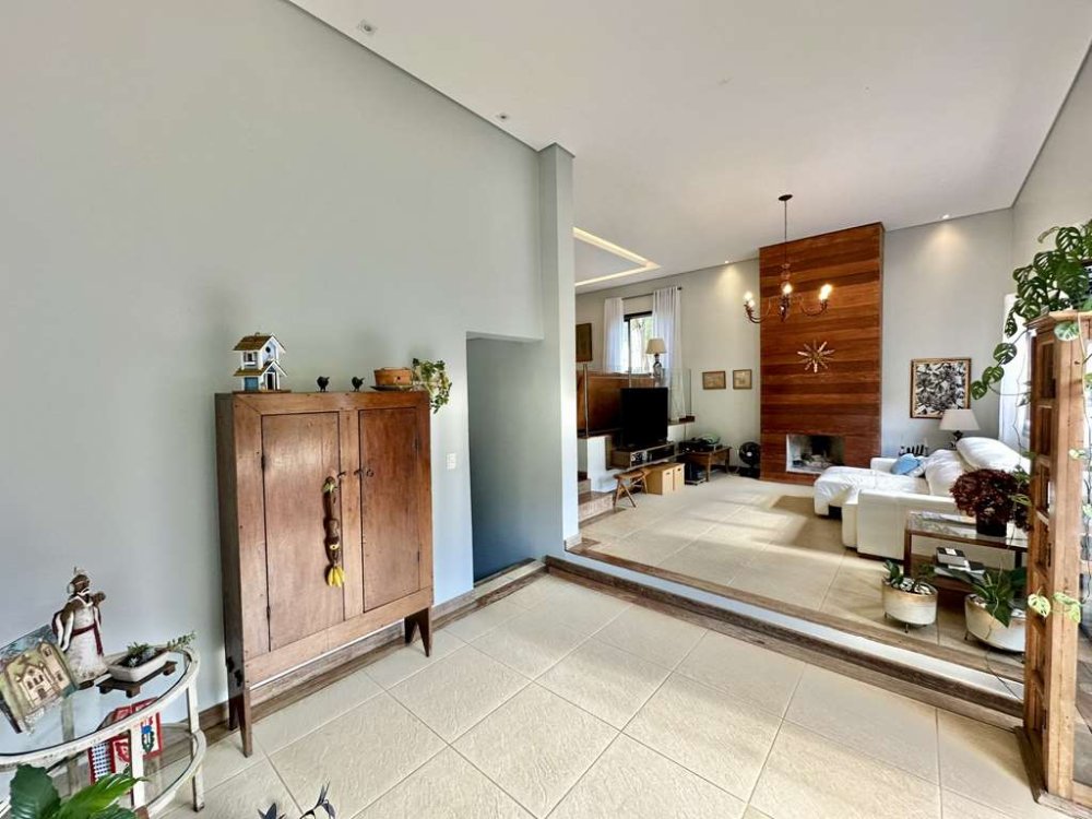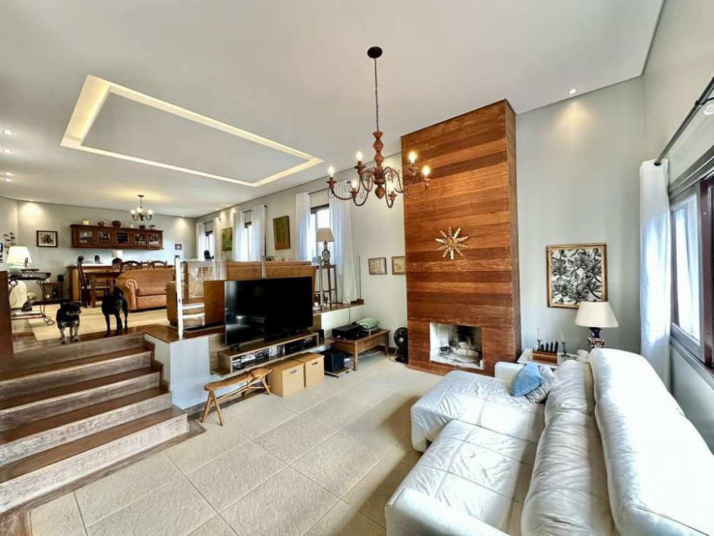 - Living com quatro ambientes em desnível, incluindo salas de jantar, estar, estar com lareira e TV, criando um espaço convidativo e aconchegante.