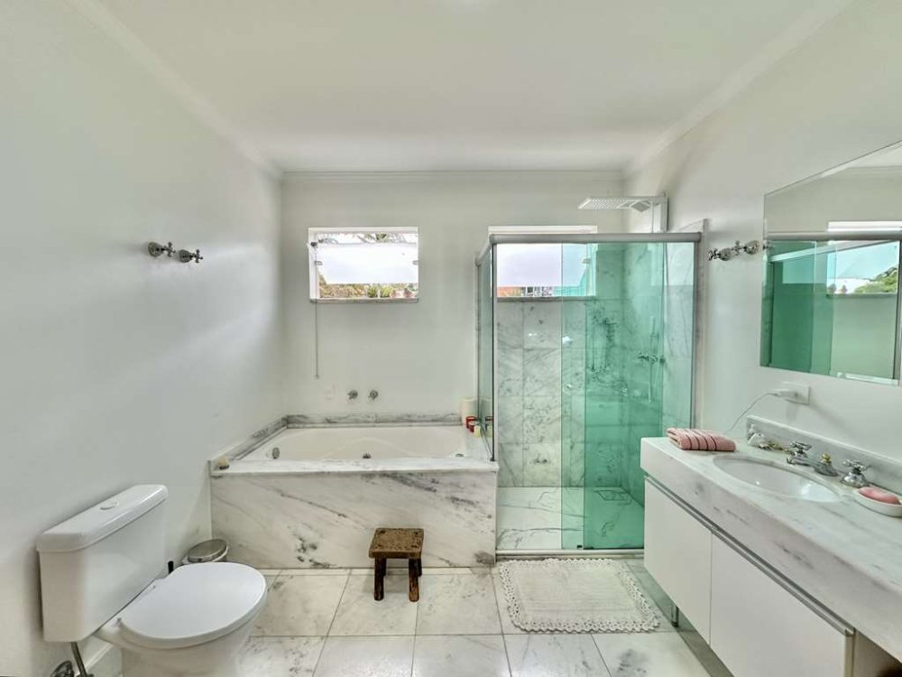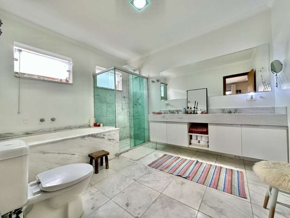 - Banheiros modernos e espaçosos, em mármore, com gabinetes, espelhos e box de vidro, sendo o da suíte máster com duas cubas e hidromassagem.