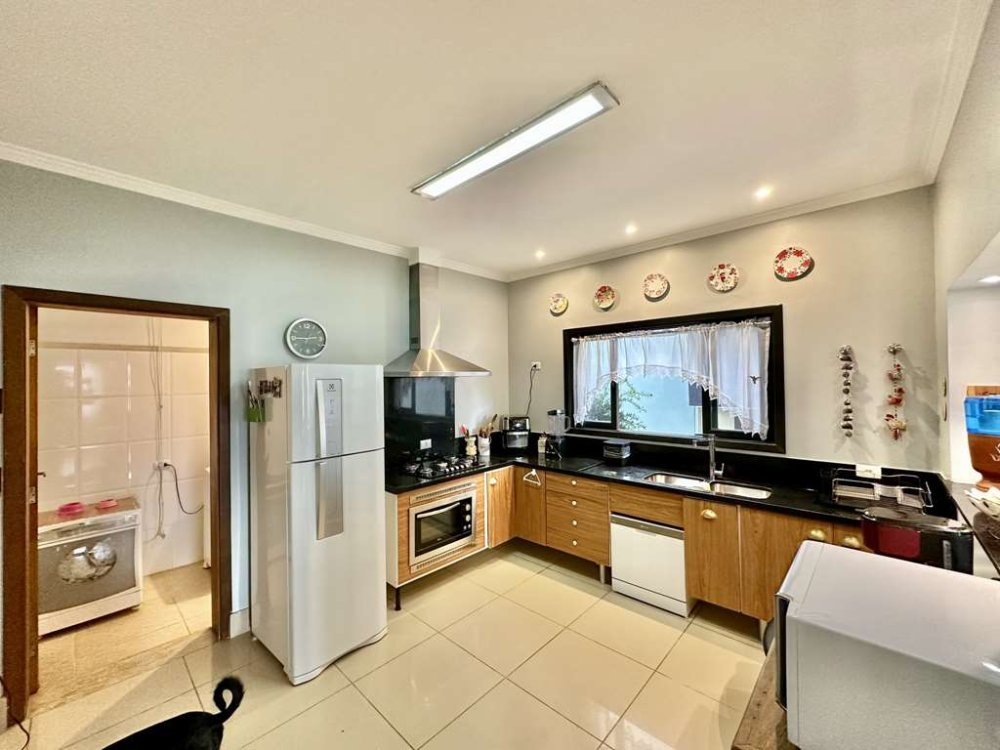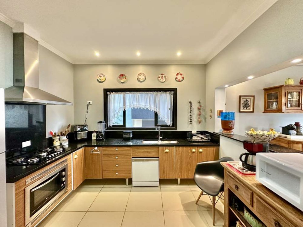 - Cozinha funcional e integrada, conectada à sala de jantar por um passa-pratos, equipada com despensa, armários planejados, forno de embutir, exaustor e duas cubas.