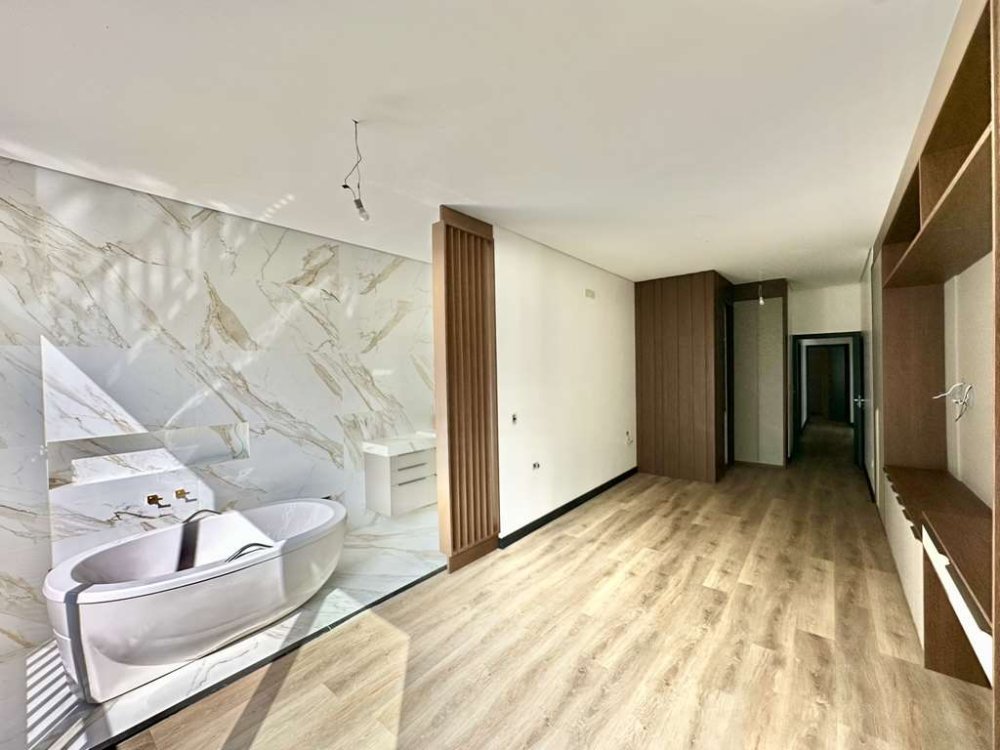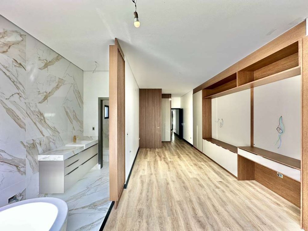 Suíte máster com closet e sala de banho panorâmica com banheira