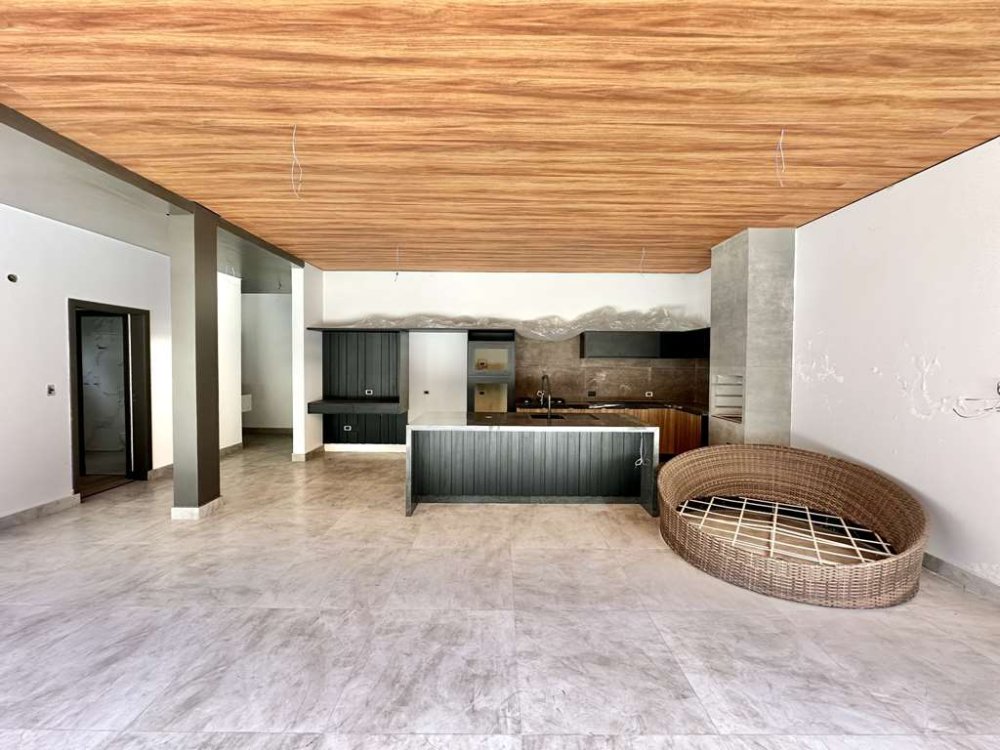 Salão gourmet equipado com churrasqueira, ilha, cooktop e balcão