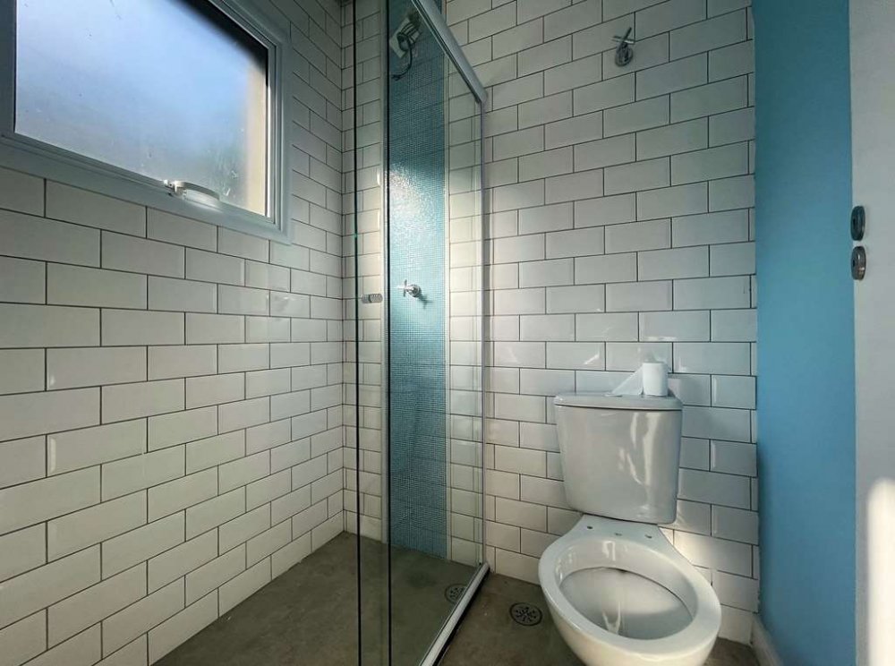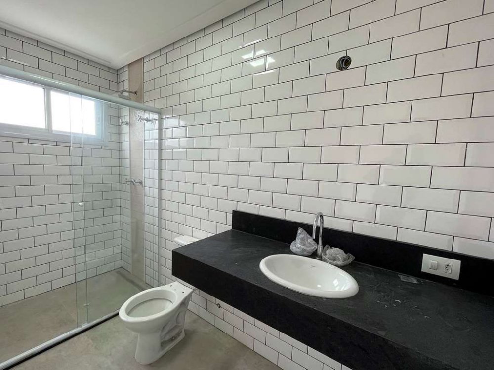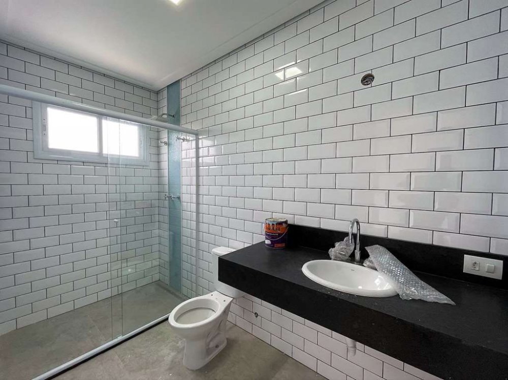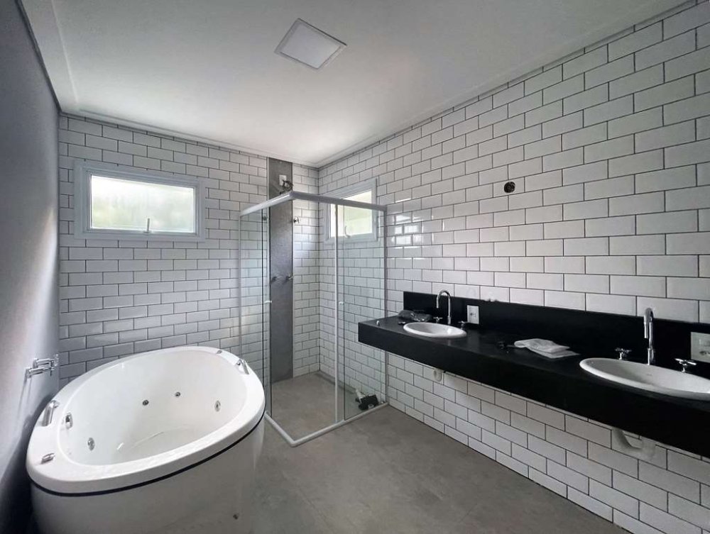 Banheiros com bancadas, pia e box de vidro, sendo a máster com 2 cubas e hidro.