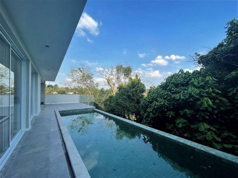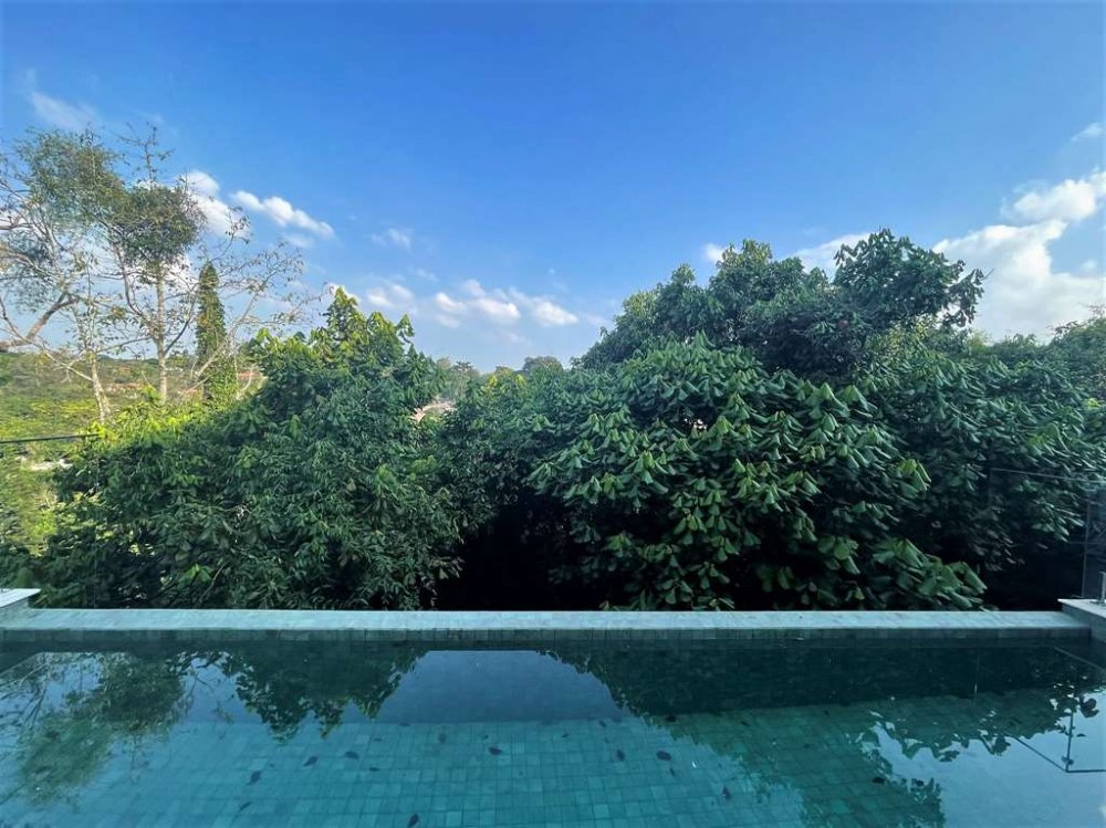 Piscina elevada sobre pilotis (8,00 m de altura) com borda infinita, ducha, solário e vista para um bosque particular. Com infraestrutura preparada para aquecimento (solar), revestida em pastilhas cerâmica tipo pedra Hijau e iluminação com controle de cores.